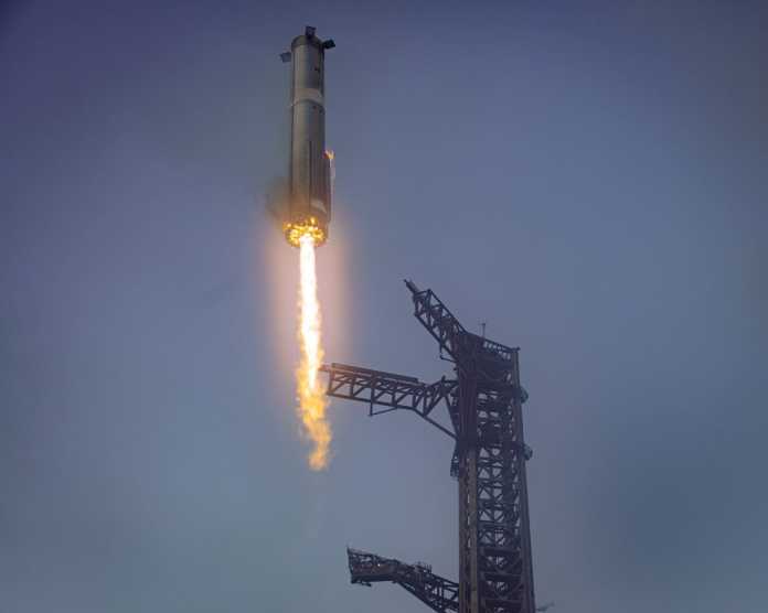 Durante el quinto vuelo del Starship, el Super Heavy fue atrapado con éxito por los brazos mecánicos de la plataforma de lanzamiento.
