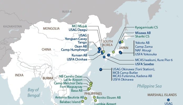 En el caso de EE.UU., la región del Indo-Pacífico corresponde al aérea de responsabilidad del INDOPACOM. En este espacio geográfico, Estados Unidos mantiene al menos 24 bases permanentes, infraestructura que se encuentra principalmente en Japón y Corea del Sur. Entre ambos países se reparten casi 80.000 efectivos, con 54.774 en Japón y 24.234 en Corea del Sur (cifras de Marzo del 2024).