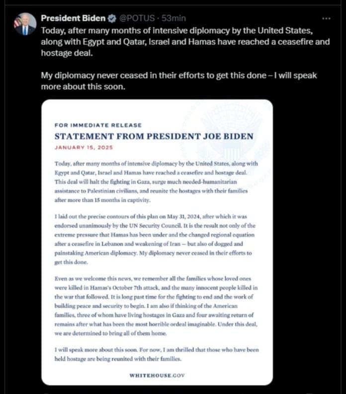 No obstante, la administración Biden no tardó en emitir declaraciones y atribuirse el crédito por los logros alcanzados. “Mi diplomacia nunca cesó en sus esfuerzos para conseguirlo. Es el resultado no solo de la presión extrema bajo la que Hamás ha estado y los cambios en la ecuación regional tras el alto el fuego en Líbano y el debilitamiento de Irán, sino también de incansable e intensa diplomacia estadounidense”, confirmó.