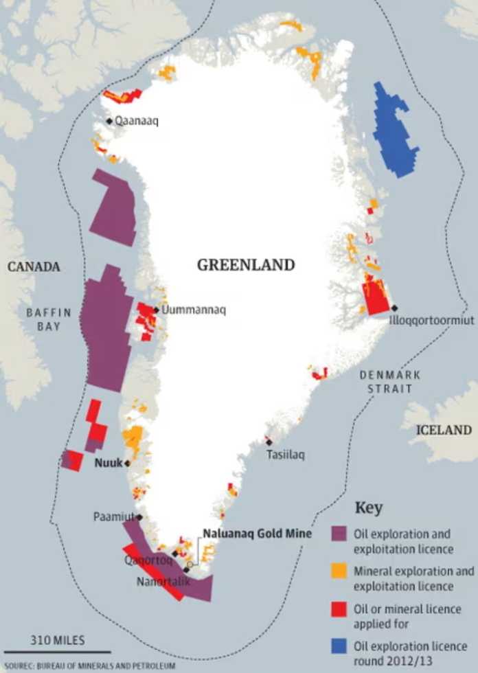 Las empresas multinacionales de recursos naturales consideran que es el momento oportuno para indagar las reservas que Groenlandia posee. Sus aguas, al abrirse más temprano y cerrarse más tarde, facilitan el acceso a las áreas remotas.