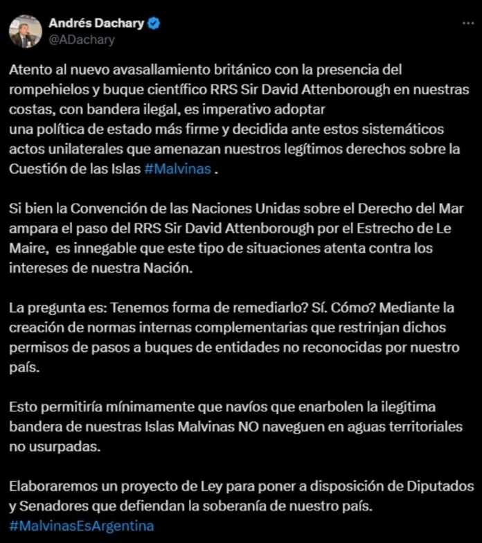 Andrés Dachary, secretario de Malvinas, Antártida, Islas del Atlántico Sur y Asuntos Internacionales de la provincia argentina, emitió un fuerte reclamo al gobierno nacional frente a los actos unilaterales que amenazan los derechos argentinos sobre nuestras Islas. Además, señaló que aunque la Convención de las Naciones Unidas sobre el Derecho del Mar permite el paso del buque por el estrecho de Le Maire, estas situaciones atentan contra los intereses de Argentina. “Elaboraremos un proyecto de Ley para poner a disposición de Diputados y Senadores que defiendan la soberanía de nuestro país”, afirmó en X.