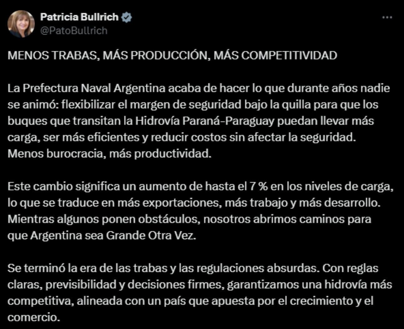 “La Prefectura Naval Argentina acaba de hacer lo que durante años nadie se animó: flexibilizar el margen de seguridad bajo la quilla para que los buques que transitan la Hidrovía Paraná-Paraguay puedan llevar más carga, ser más eficientes y reducir costos sin afectar la seguridad. Menos burocracia, más productividad”, declaró Bullrich en X. Además, notificó que el cambio permite un aumento de hasta 7% en los niveles de carga, “lo que se traduce en más exportaciones”.