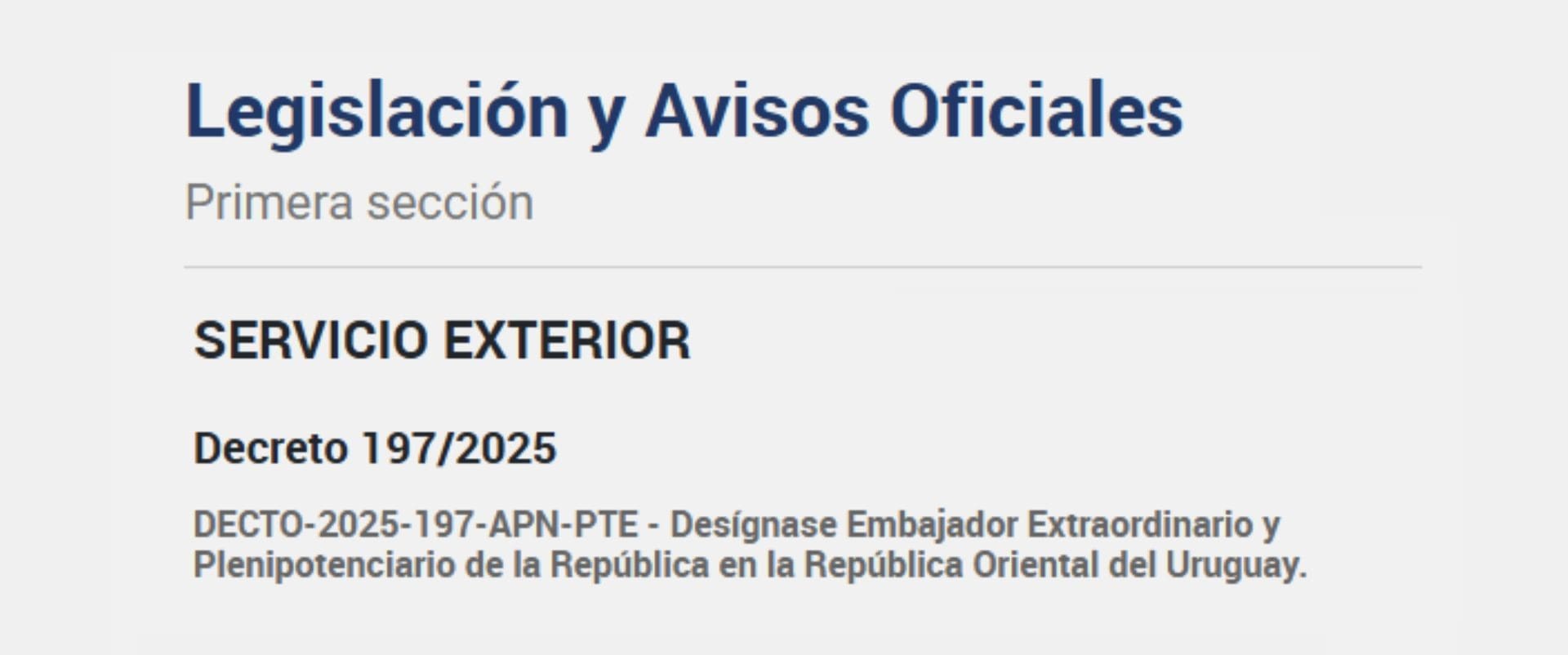 En este contexto, por medio del Decreto 197/2025 publicado este martes en el Boletín Oficial, Beraud será quién represente a la Argentina en Uruguay y frente al Mercosur y la ALADI. “Desígnase Embajador Extraordinario y Plenipotenciario de la República en la REPÚBLICA ORIENTAL DEL URUGUAY al señor Embajador Extraordinario y Plenipotenciario Alan Claudio BERAUD (D.N.I. N° 13.297.097), sin perjuicio de sus actuales funciones como Representante Permanente de la República para MERCOSUR y ALADI”, establece el primer artículo del decreto publicado.