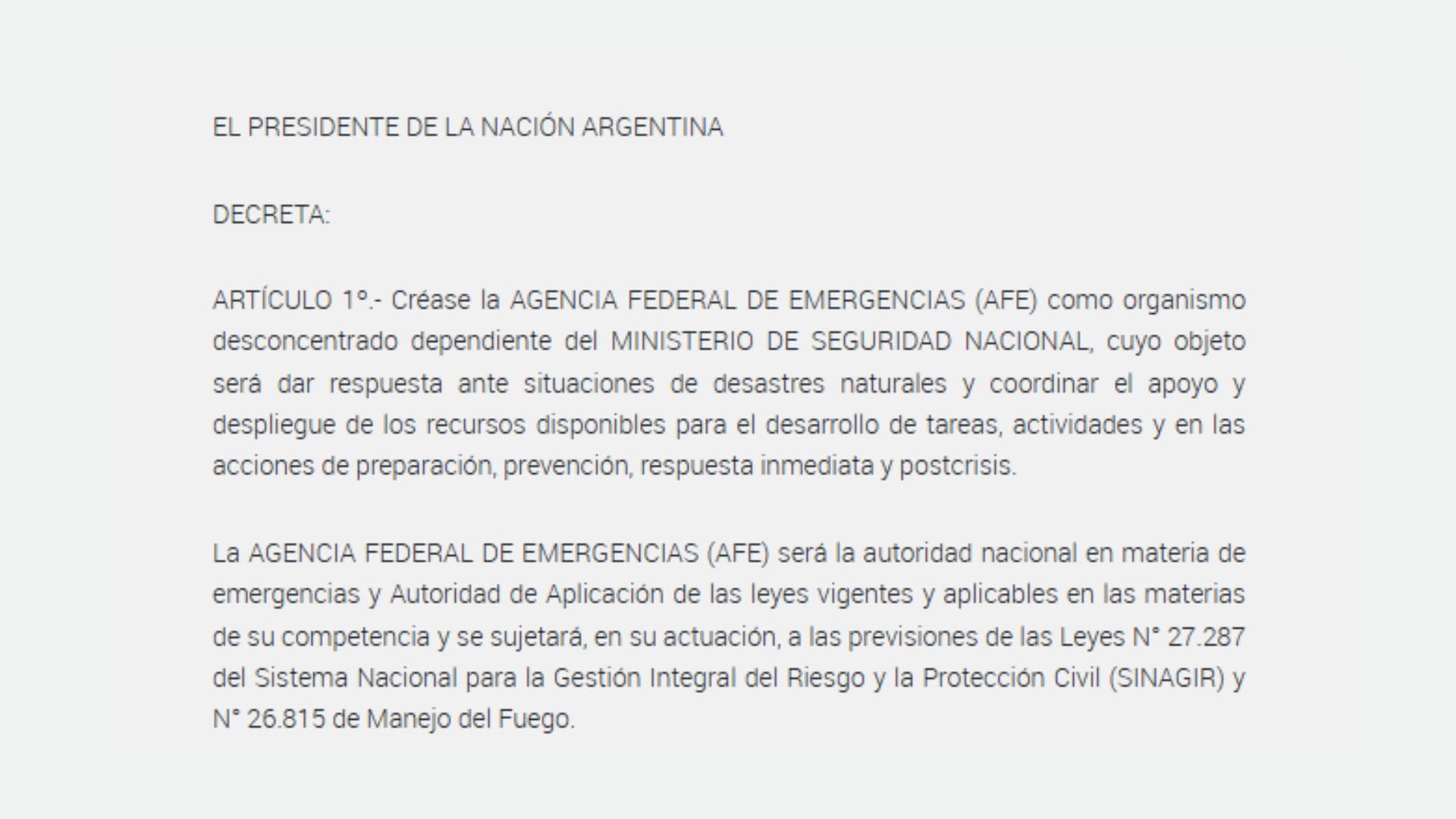 “Resulta necesario centralizar en un solo organismo las estrategias a cargo del Estado Nacional en materia de asistencia directa ante situaciones de emergencia, con el fin de reducir los efectos negativos sobre la población afectada […] Corresponde crear la AGENCIA FEDERAL DE EMERGENCIAS (AFE) como organismo desconcentrado dependiente del MINISTERIO DE SEGURIDAD NACIONAL, la que tendrá como competencia dar respuesta ante situaciones de desastres naturales”, afirma la publicación del Decreto.