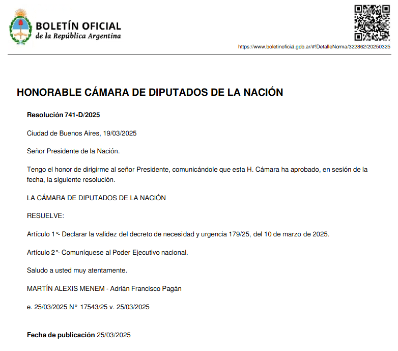 “Señor Presidente de la Nación. Tengo el honor de dirigirme al señor Presidente, comunicándole que esta H. Cámara ha aprobado, en sesión de la fecha, la siguiente resolución. LA CÁMARA DE DIPUTADOS DE LA NACIÓN RESUELVE: Artículo 1°- Declarar la validez del decreto de necesidad y urgencia 179/25, del 10 de marzo de 2025; Artículo 2°- Comuníquese al Poder Ejecutivo nacional. Saludo a usted muy atentamente, MARTÍN ALEXIS MENEM – Adrián Francisco Pagán”, reza la Resolución.