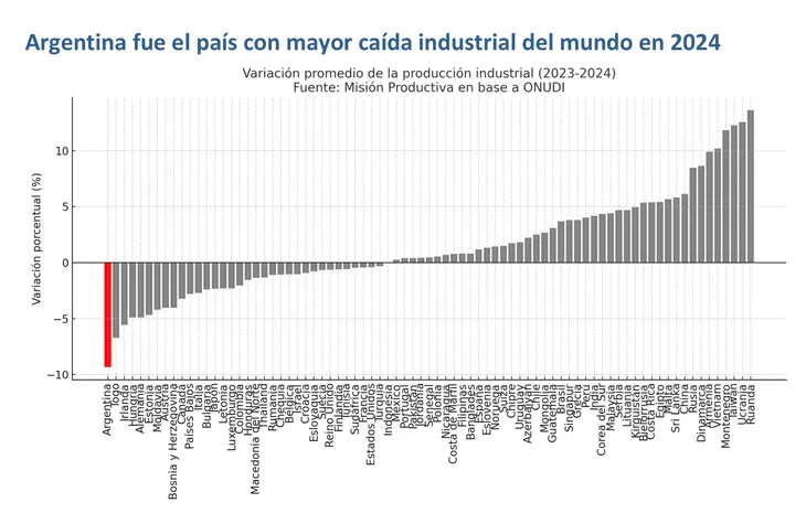 Un reciente relevamiento realizado en 79 países arrojó preocupantes datos sobre el desarrollo industrial de Argentina en 2024 comparado con el año anterior: la actividad acumuló una caída del 9,4 %. Los datos son confirmados por el Instituto Nacional de Estadística y Censos (Indec), calificando este número como el peor desempeño del sector desde 2022.