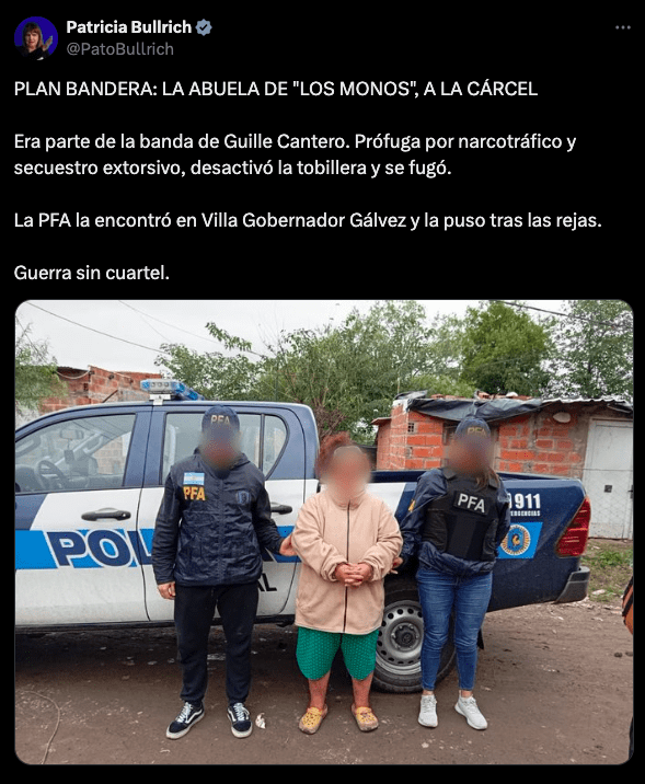 En este sentido, cabe destacar que en los últimos días, el Comando detuvo por segunda vez a la “Abuela de Los Monos”, integrante de una de las bandas narcos más importantes que opera en Rosario, acusada por delitos de narcotráfico y secuestro extorsivo. La mujer, que está condenada, por un secuestro extorsivo ejecutado en el 2021, a seis años de prisión domiciliaria, se había fugado de su domicilio. Debido a que, la conexión de la tobillera electrónica que la monitoreaba se desactivó, por lo que se había perdido su localización. Finalmente, las autoridades policiales lograron detenerla nuevamente. La Ministra Bullrich celebró la detención de la Abuela de Los Monos, a través de su cuenta en la red social X, adjudicándole el logro al Plan Bandera del Gobierno, en medio de un intenso año electoral.