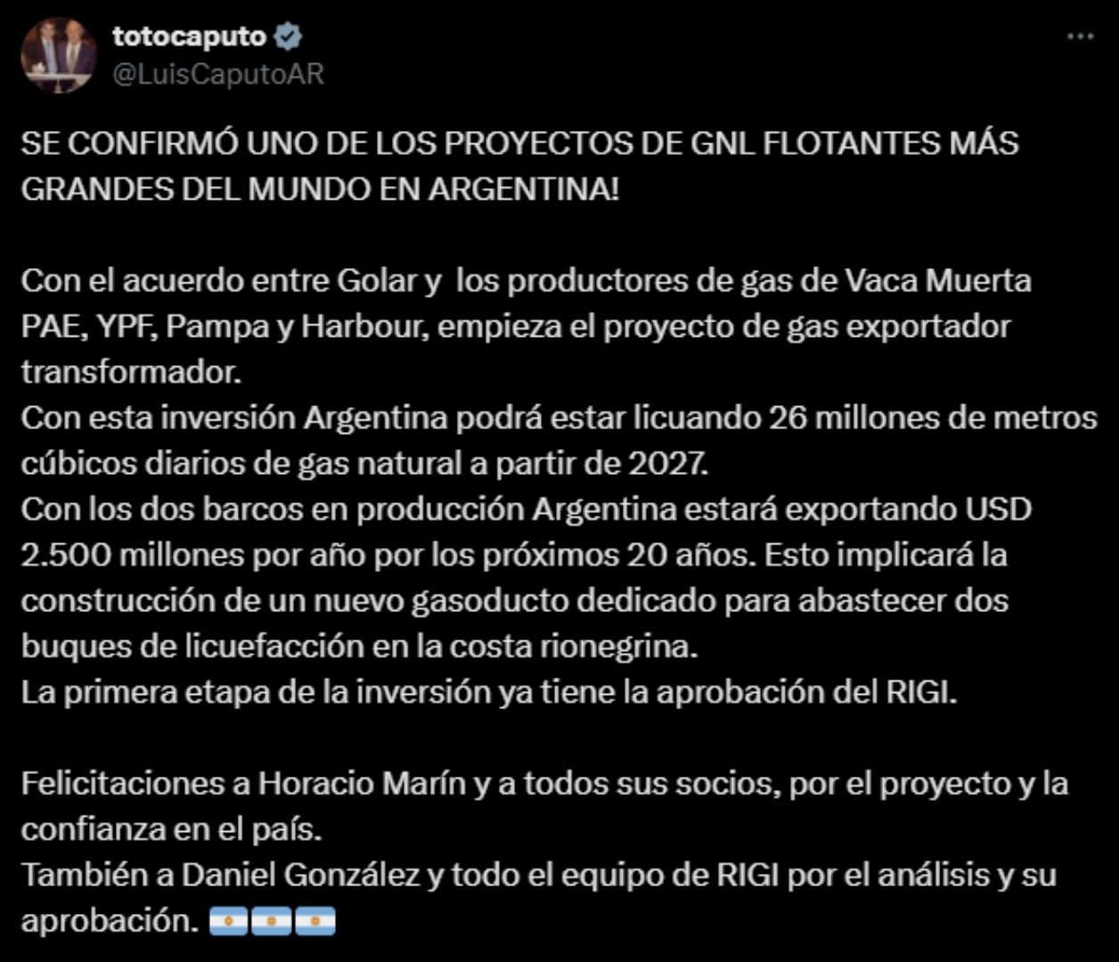 Ahora, según lo comunicado por el ministro de Economía, Luis Caputo, a través de la red social X, se trata de “uno de los proyectos de GNL (gas natural licuado) flotantes más grandes del mundo en Argentina”. El cambio de estrategia por parte de YPF fue comunicado recientemente, cuando la compañía decidió instalar seis buques productores de GNL en la costa de Río Negro en lugar de construir una planta de licuefacción en tierra, como se había acordado con Petronas anteriormente.