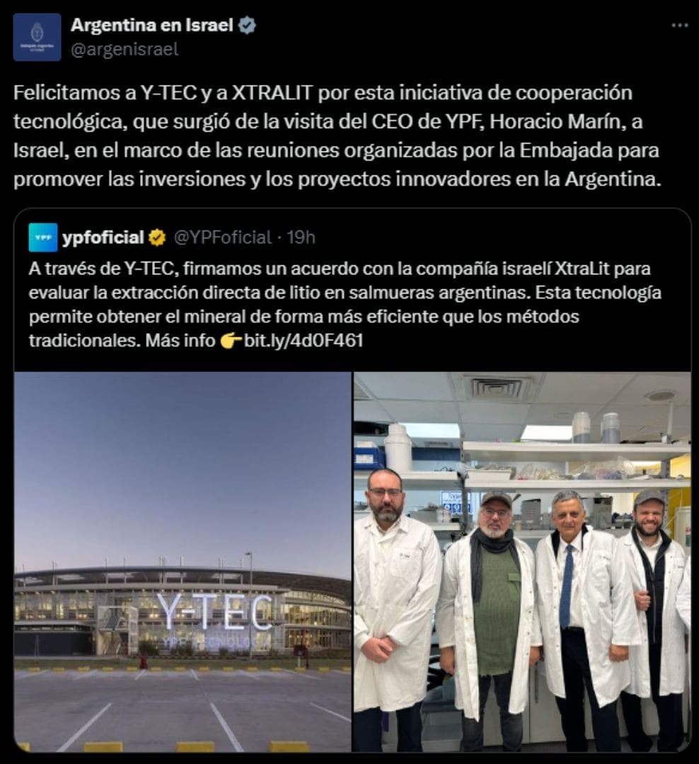 La noticia fue celebrada por el embajador de la República Argentina en Israel, Axel Wahnish, y por la embajada en sí misma. “Felicitamos a Y-TEC y a XTRALIT por esta iniciativa de cooperación tecnológica, que surgió de la visita del CEO de YPF, Horacio Marín, a Israel, en el marco de las reuniones organizadas por la Embajada para promover las inversiones y los proyectos innovadores en la Argentina”, declararon por X.