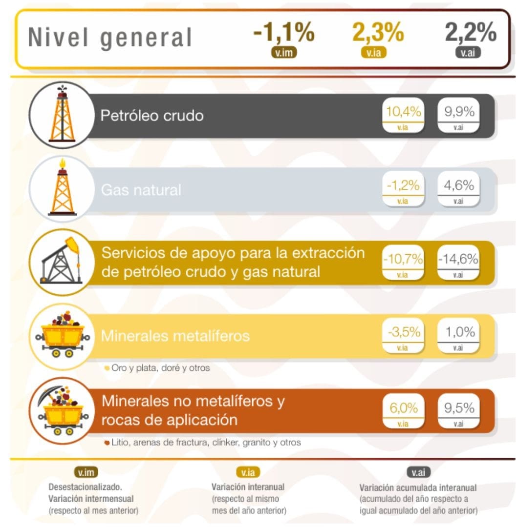 A grandes rasgos, podría afirmarse que el sector con mayor crecimiento es el de la Extracción de petróleo crudo y gas natural, que creció un 2,3% interanual, con un aumento acumulado del 1,6% en el primer trimestre del año. Le sigue el de Minerales no metalíferos y rocas de aplicación, con tuvo un crecimiento del 6,0%, impulsado por el aumento del 20,0% en la producción de arenas, canto rodado y triturados pétreos, y el de la Extracción de minerales para la fabricación de productos químicos, con un crecimiento destacado del 36,5%. No obstante, los Minerales metalíferos registraron una caída del 3,5%.