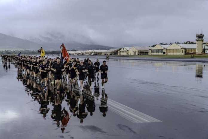 Soldados de la 25.ª Brigada de Aviación de Combate corren junto a los hangares en la línea de vuelo del aeródromo Wheeler del Ejército, en Hawái. Fuente: U.S. Army.