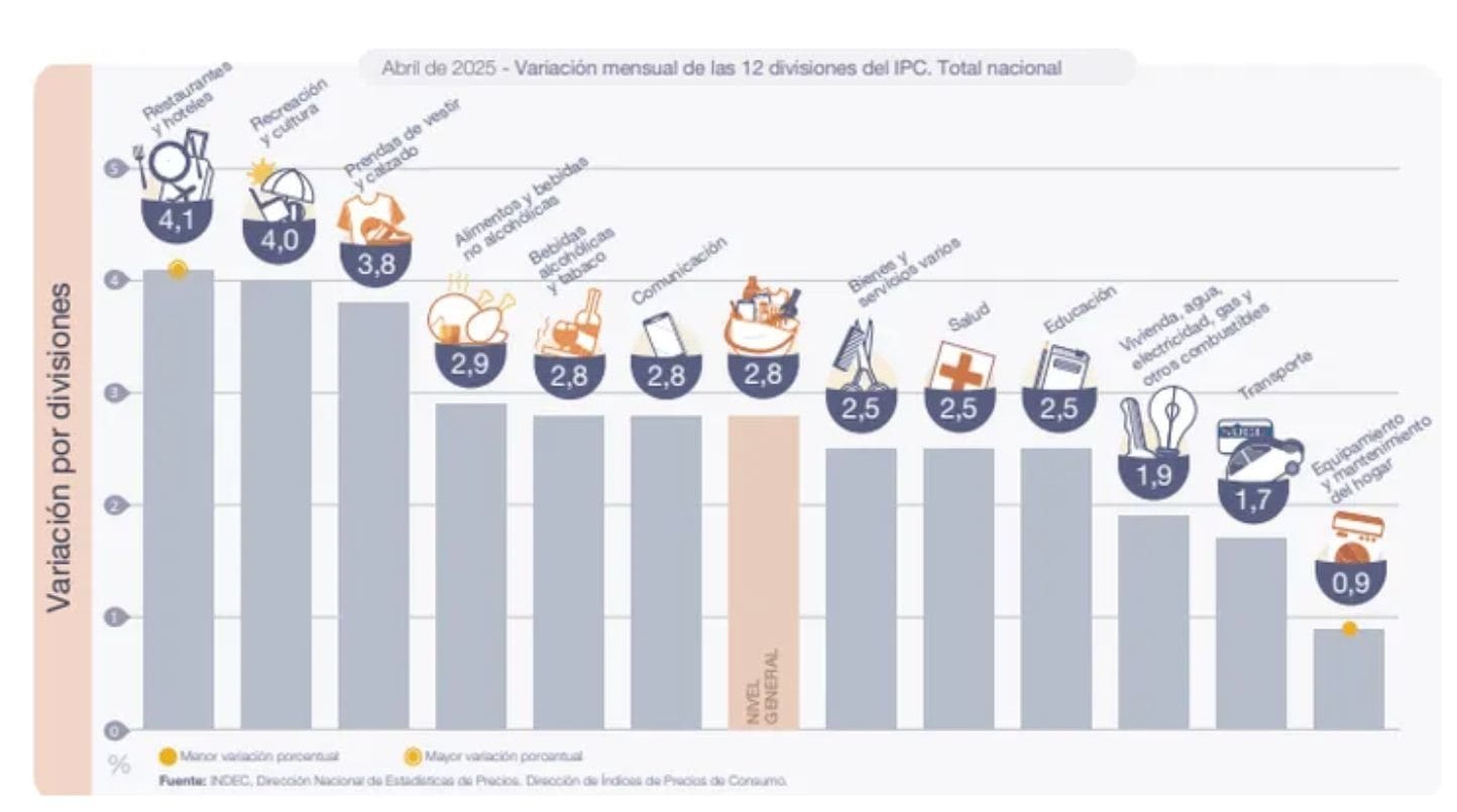 Las cifras se condicen con el informe del en el Índice de Precios al Consumidor (IPC) difundido por el INDEC, que detalla que por encima del promedio subieron Recreación y cultura (+4%), Bebidas alcohólicas y tabaco (+2,8%) y Comunicación (+2,8%).