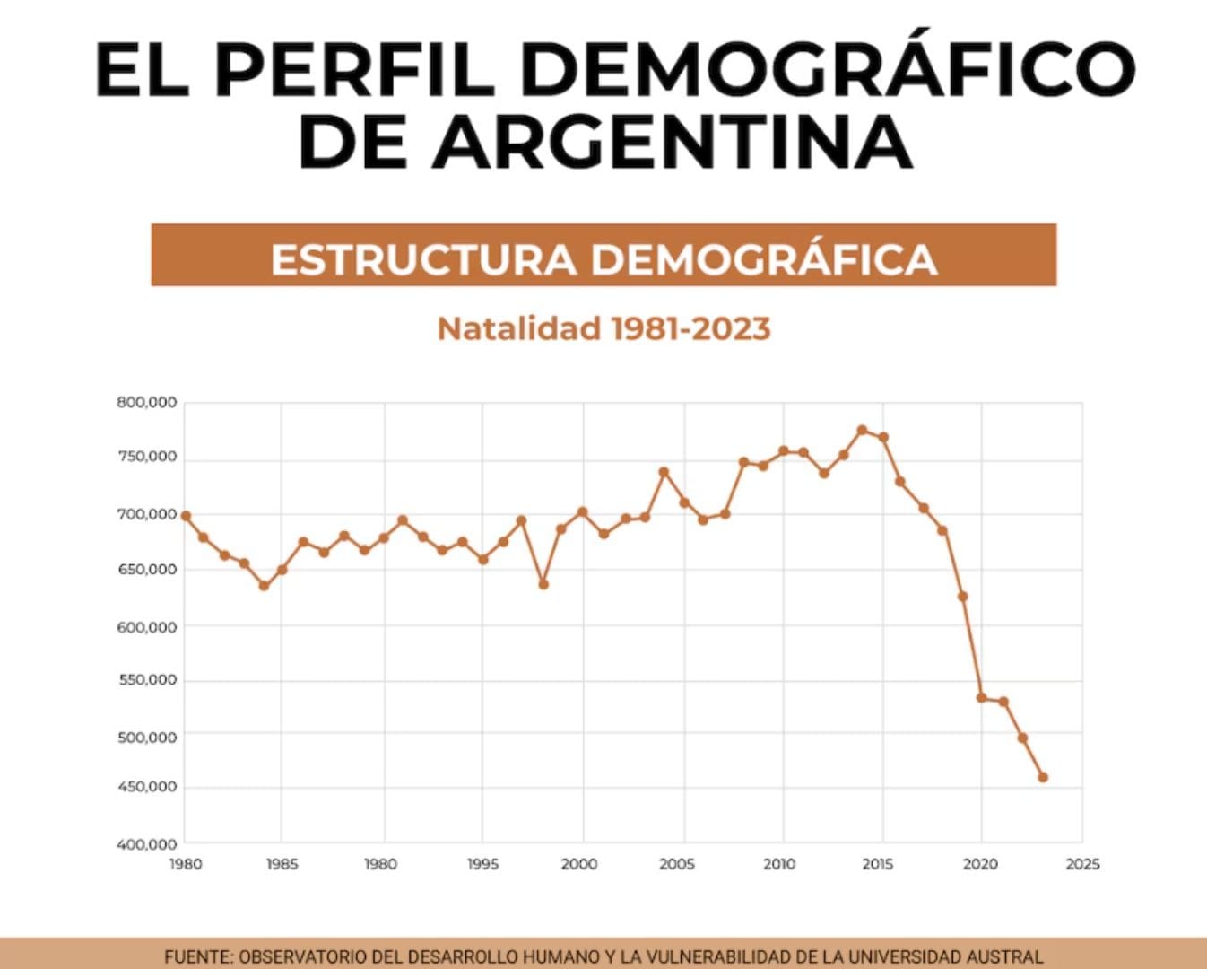 Un reciente estudio del Observatorio del Desarrollo Humano de la Universidad Austral reveló que la tasa de natalidad en Argentina ha disminuido drásticamente desde 2014, acumulando una caída del 40% en menos de una década. Esta cifra refleja una de las disminuciones más bruscas en América Latina.