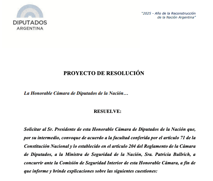 Fragmento del Proyecto de Resolución que solicita un pedido de informes a la Ministra Patricia Bullrich.