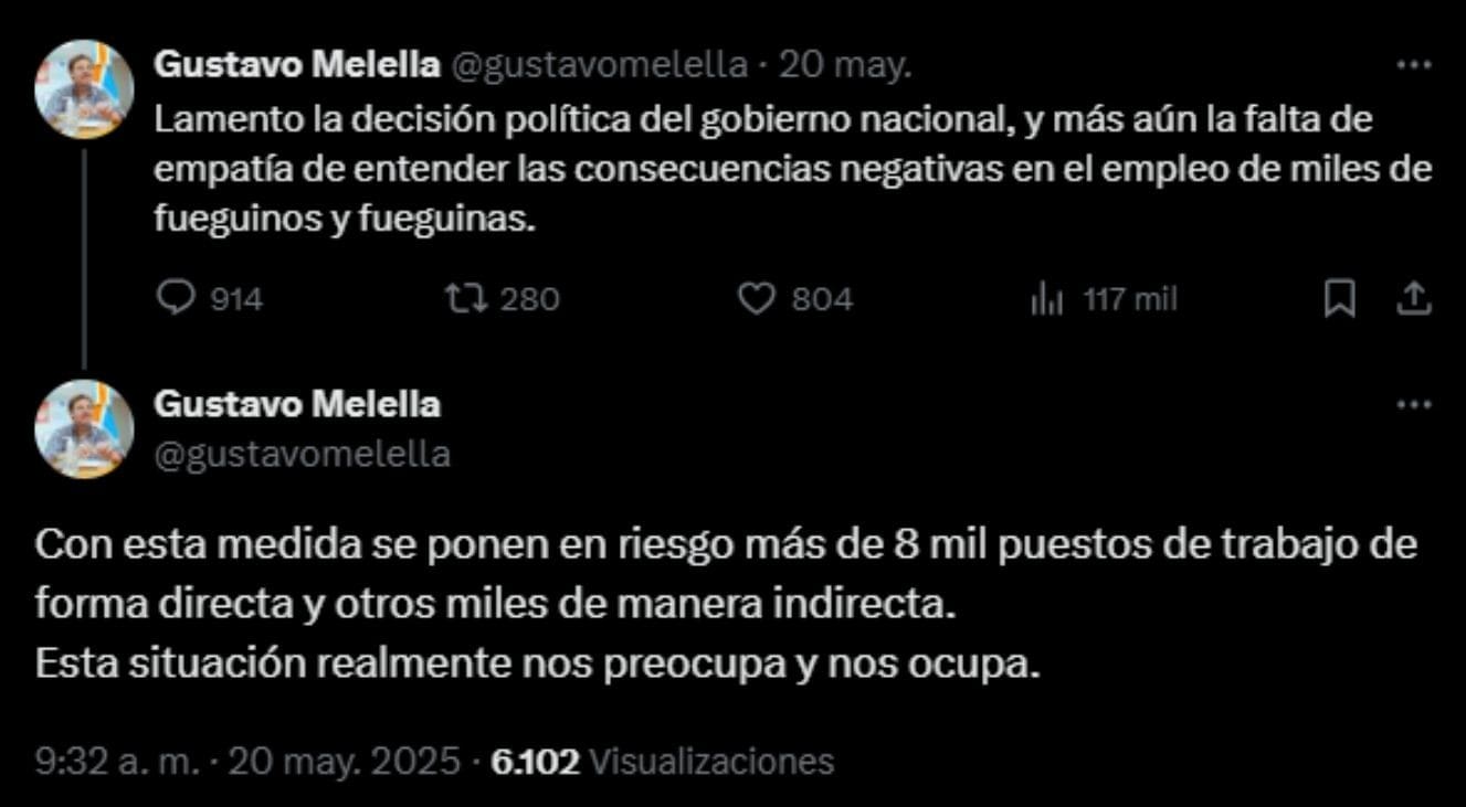 De manera similar, el gobernador de Tierra del Fuego, Gustavo Melella, rechazó la medida y advirtió que a partir de dicha iniciativa “se ponen en riesgo más de 8.000 puestos de trabajo de forma directa y otros miles de manera indirecta”. El mandatario también instó a unificar a distintos sectores del aparato productivo para fortalecer el reclamo contra Nación.
