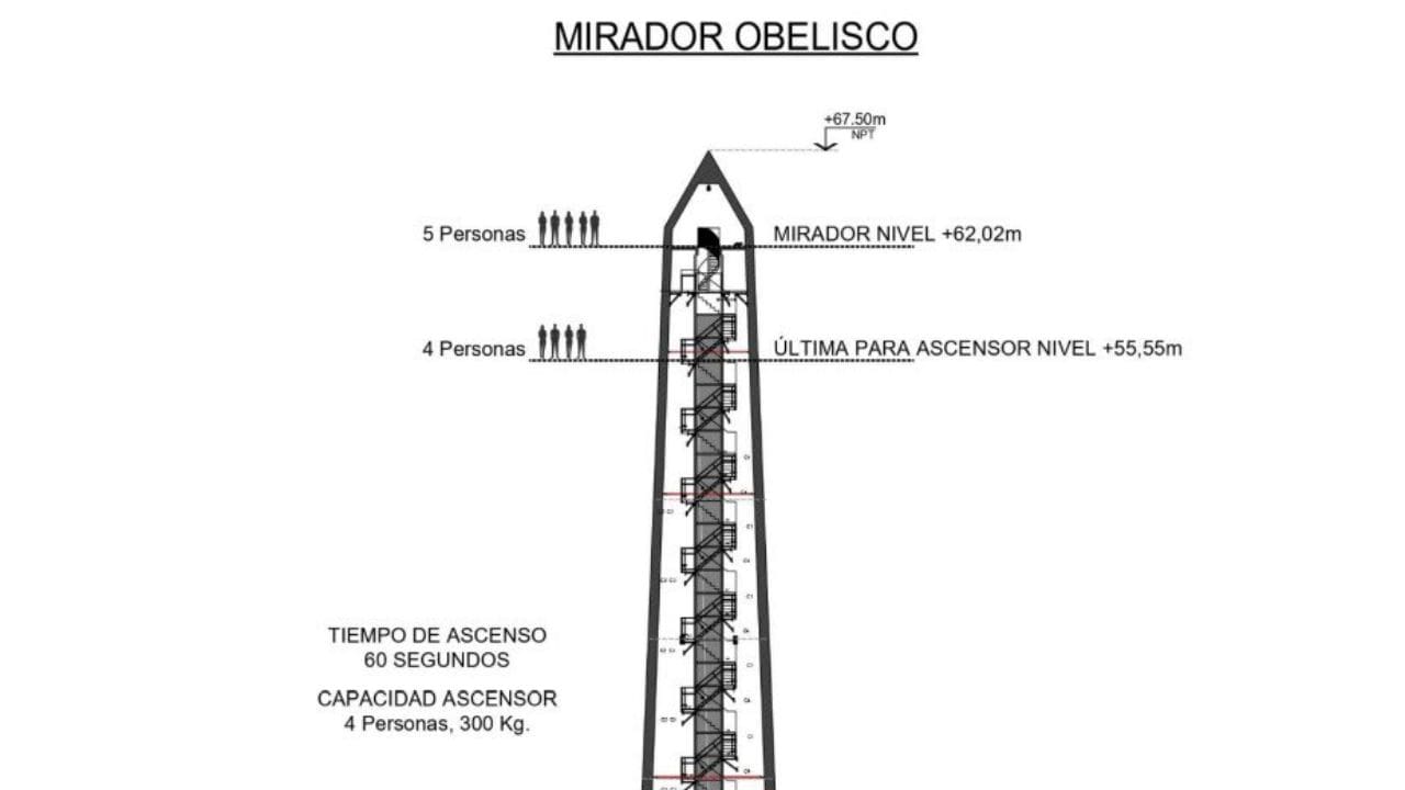 El proceso licitatorio se anuncia pocas semanas después de que se completaran reformas clave en el Obelisco, entre ellas la instalación de un ascensor interno que permitirá el acceso de visitantes a un nuevo mirador panorámico. Este dispositivo, ubicado en uno de los laterales del monumento, permite ascender en 60 segundos hasta los 55,55 metros, desde donde los visitantes podrán continuar por escaleras hasta el nivel del mirador, situado a 62,02 metros de altura. La capacidad del ascensor es de 4 personas o 300 kg, y el espacio final podrá albergar hasta 5 personas simultáneamente.
