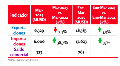 El superávit acumulado en el primer trimestre del año fue de 761 millones de dólares, representando una abrupta disminución en términos de comparación interanual, cuando se registró un superávit de 4.401 millones de dólares. La reducción y disminución del superávit comercial argentino se debe al significativo crecimiento de las importaciones, que aumentaron un 38,7% respecto a marzo de 2024 y un 35%, en comparación al primer trimestre de 2024. Mientras que las exportaciones, únicamente disminuyeron un 2,5% respecto a marzo de 2024, quedando muy por debajo de la cifra de importaciones, y aumentaron un 5,3% en relación al primer trimestre del 2024.