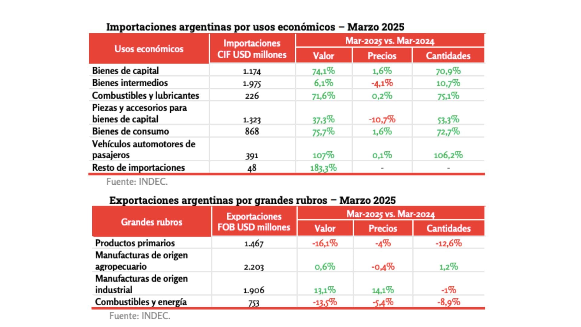 En paralelo, las importaciones tuvieron un abrupto crecimiento en el primer trimestre del año, lo que impactó directamente en la baja del superávit comercial. El valor de las mismas, en marzo de 2025, fue de 6.006 millones de dólares, representando el mayor valor registrado desde octubre de 2024. El aumento se explica por el incremento de las cantidades importadas (47,5%), ante una caída del 6% de los precios. Según los gráficos presentados, se observaron aumentos en todos los usos económicos (Bienes de Capital, Bienes Intermedios, Combustibles y Lubricantes, Bienes de consumo, Vehículos automotores de pasajeros, entre otros). Los mayores aumentos en volumen y cantidad de importaciones fueron en “Vehículos automotores de pasajeros” (106,2%), “Combustibles y Lubricantes” (75,1%) y “Bienes de consumo” (72,7%).