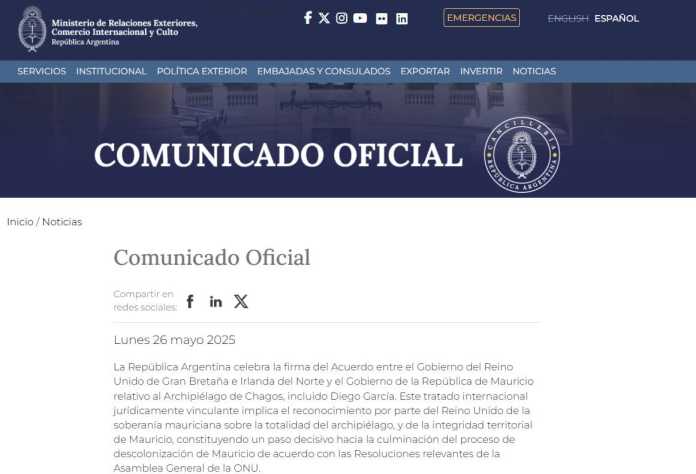 Tras la firma del acuerdo entre el Reino Unido y Mauricio sobre el Archipiélago de Chagos, la Cancillería argentina emitió un comunicado celebrando el reconocimiento británico de la soberanía mauriciana sobre dicho territorio. El tratado constituye un hito en el proceso de descolonización de Mauricio. Para Argentina, este avance representa un precedente clave que reafirma la vigencia del derecho internacional y la importancia de los mecanismos pacíficos de resolución de disputas territoriales, especialmente aplicados a la cuestión de las Islas Malvinas.