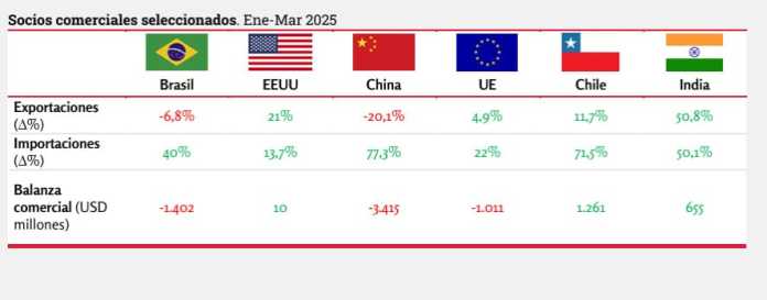 En cuanto al análisis de los principales destinos, se muestra que la relación comercial de Argentina con China y Brasil se debilitó. Las exportaciones hacia el gigante asiático cayeron un 20,1%, mientras que hacia Brasil descendieron un 6,8%. En contrapartida, se registraron aumentos importantes hacia Estados Unidos (+21%), Chile (+11,7%) e India, que destaca con un asombroso crecimiento del 50,8%. En un contexto de creciente competencia entre las dos principales potencias, estos cambios reflejan tanto la búsqueda de nuevos mercados como una reacción a condiciones económicas y políticas fluctuantes en los países socios.