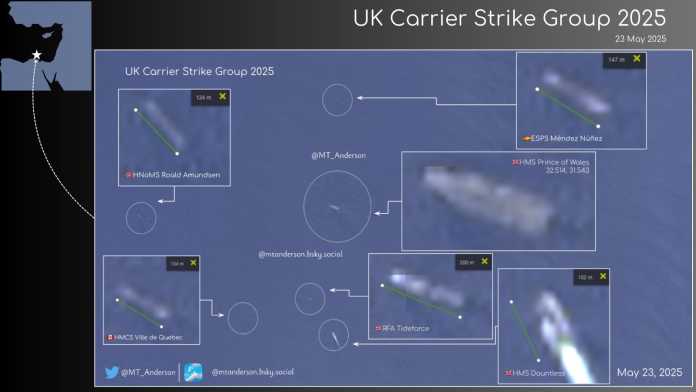 Una imagen satelital publicada el 23 de mayo de 2025 muestra al Grupo de Ataque de Portaaviones del Reino Unido navegando en formación a unos 150 km al noroeste de Puerto Saíd, Egipto. En el centro de la agrupación se distingue al HMS Prince of Wales, identificado con coordenadas 32.514, 31.543, flanqueado por otras embarcaciones aliadas como la fragata británica HMS Dauntless, el buque logístico RFA Tideforce, la fragata española ESPS Méndez Núñez, el buque noruego HNoMS Roald Amundsen y el canadiense HMCS Ville de Quebec.