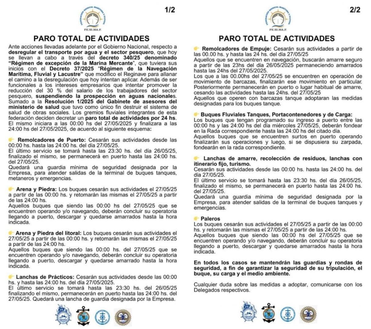Este miércoles, la Federación Sindical Marítima y Fluvial (FESIMAF) lleva a cabo un paro total de actividades debido a la decisión del gobierno nacional de desregular la Marina Mercante. La FESIMAF considera que la medida impacta en los trabajadores marítimos y fluviales. Por ende, la medida de fuerza busca defender esos derechos, afectando a todos los buques y operaciones marítimas y fluviales del país.