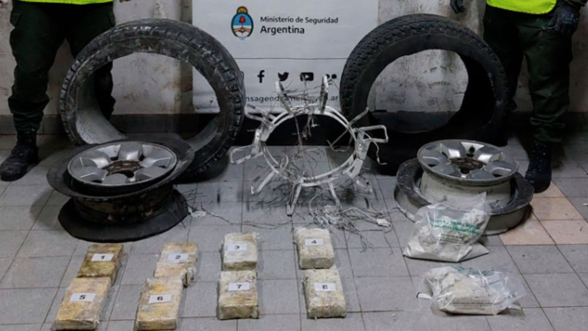 En relación con ello, la Gendarmería Nacional Argentina, en el marco del Plan Güemes impulsado desde la cartera de seguridad que dirige Bullrich, también ha secuestrado e incautado 10 kilos de cocaína, a la vez que, detuvo a un hombre. El hecho inició cuando personal de la Patrulla Fija “El Naranjo” del Escuadrón 45 “Salta” de GNA detuvo un vehículo sospechoso, dado que las pesquisas habían arrojado un posible tráfico en la zona. Cuando se procedió a la inspección del rodado, los agentes de Gendarmería detectaron irregularidades en una de las ruedas y visualizaron la presencia de paquetes dentro de una estructura circular y metálica. Finalmente, extrajeron ochos “panes” y dos paquetes, que luego de ser sometidos a la prueba de campo Narcotest dieron resultado positivo para cocaína, con un peso total de 10 kilos 523 gramos. La Unidad Fiscal Federal de Salta secuestró el estupefaciente y el rodado y el conductor fue detenido, por haber infringido la Ley Nº23.737.