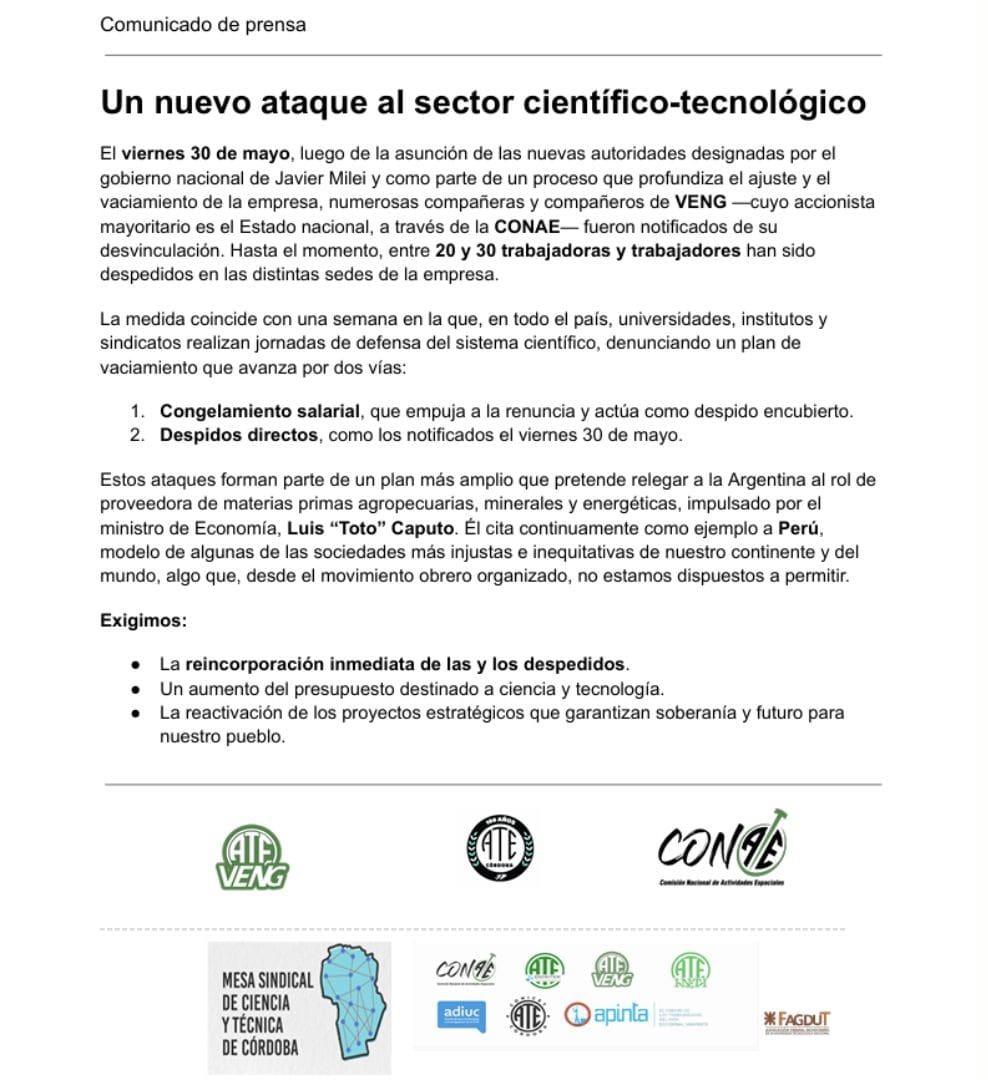 La empresa aeroespacial VENG, vinculada a la Comisión Nacional de Actividades Espaciales (CONAE), enfrenta una crítica situación de despidos de trabajadores, generando una amplia preocupación en el sector aeroespacial argentino. La reciente desvinculación de empleados en su sede de Córdoba, donde al menos 16 trabajadores fueron despedidos el pasado viernes, fue denunciada por la Asociación de Trabajadores del Estado (ATE) como un “plan de vaciamiento” del sector científico y tecnológico estatal.