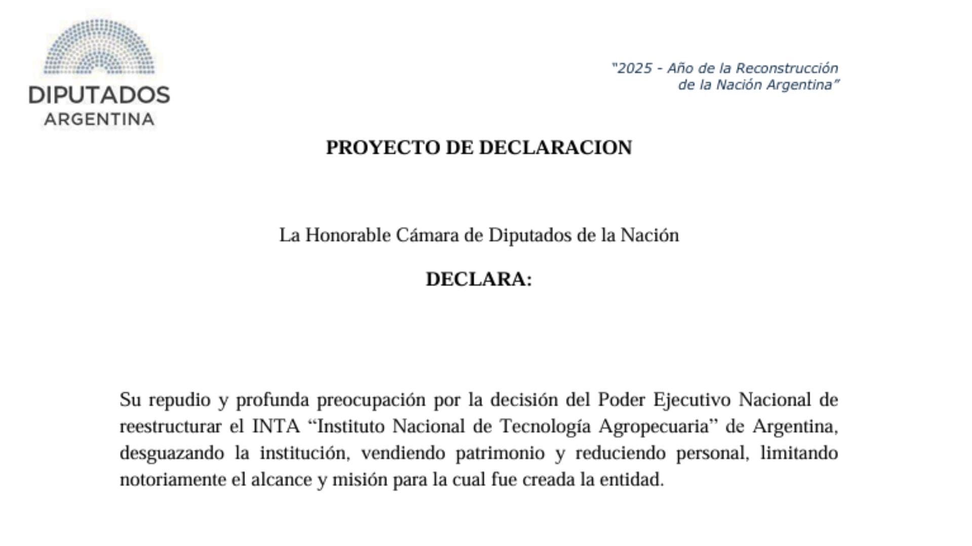 Frente a los recientes anuncios desde el Gobierno nacional sobre reformas al Instituto Nacional de Tecnología Agropecuaria (INTA), un grupo de diputados repudió la posibilidad de llevar a cabo estas medidas y solicitó explicaciones al Poder Ejecutivo. Para los legisladores, las políticas atentan contra el instituto en su funcionamiento, su autonomía y su crucial rol en el desarrollo agropecuario argentino.