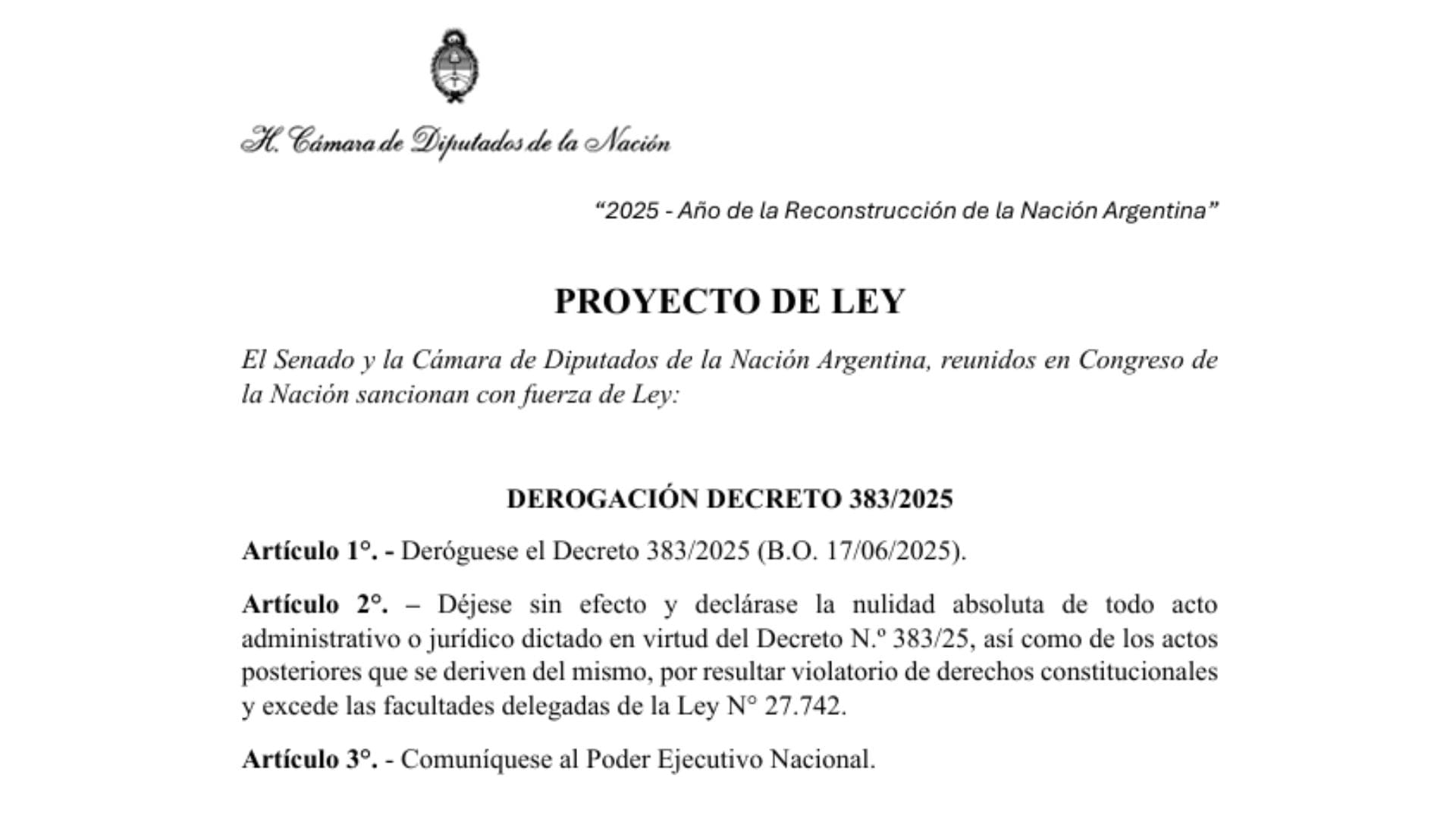 A lo largo de la semana pasada, una multiplicidad de diputados de diversos partidos políticos han presentado proyectos de ley para que el Gobierno nacional derogue el Decreto 383/2025 del Poder Ejecutivo Nacional, donde se aprueba una modificación del estatuto de la Policía Federal Argentina (PFA). Entre los principales argumentos, los legisladores sostienen que es contrario a lo establecido en los artículos 18, 19, 29, 75 inciso 22, 76 y 99 inciso 3 de la Constitución Nacional.