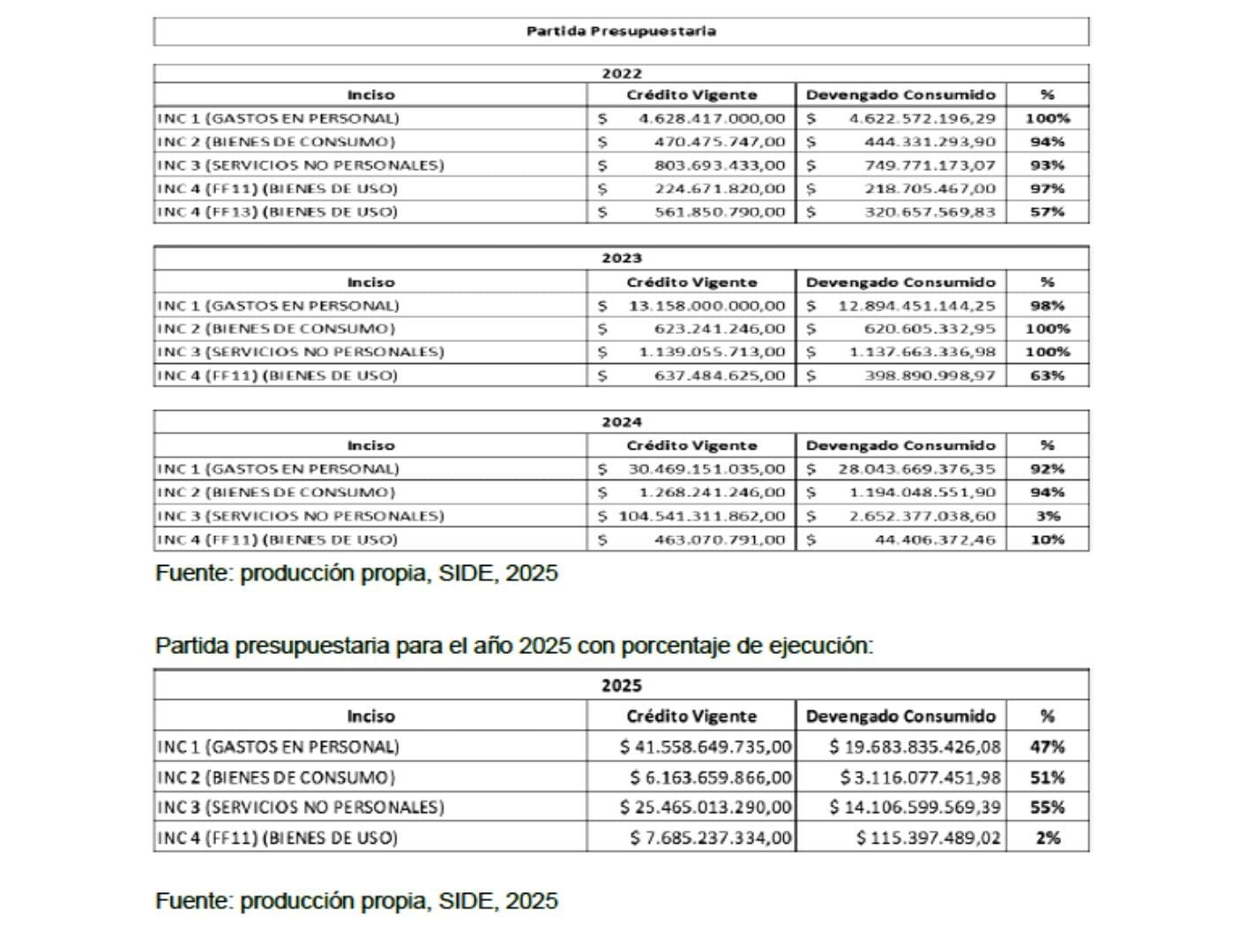 Lo más llamativo, quizás, es que la partida presupuestaria de los años 2024 y 2025 excede ampliamente la de años anteriores, específicamente en el inciso “Servicios No Personales”. Para este año, el crédito vigente para Gastos en Personal es de $41.558.649, mientras que el de Servicios No Personales es de $25.465.013. Esto se suma a la ampliación presupuestaria de $7.366 millones para la SIDE a través del DNU 186/2025 impulsado por el Presidente de la Nación, Javier Milei, de los cuales $1.625 millones se destinarían a gastos reservados.
