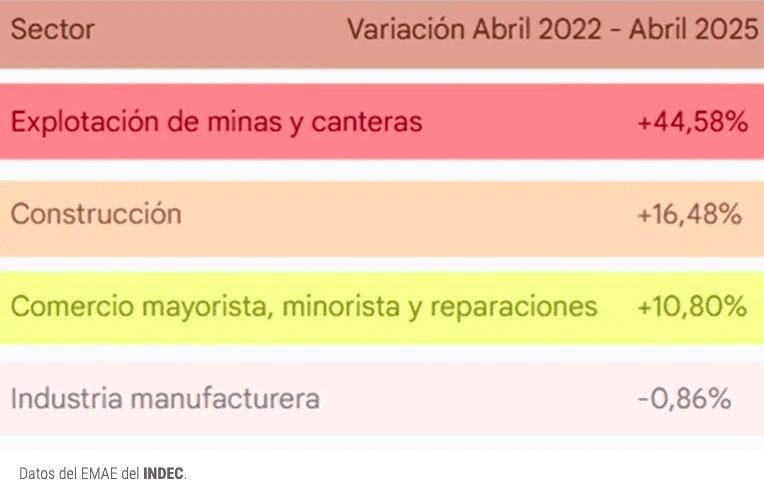 Finalmente, el sector de la “Industria manufacturera” evidenció una variación negativa en el período analizado, de abril de 2022 a abril de 2025, llegando a alcanzar una caída del 0,86%. Este dato sugiere cierto estancamiento o contracción del sector, en el período general, a pesar de que en el mes de abril del corriente año mostró una leve recuperación. No obstante, ello es una señal positiva de recuperación, tras dos períodos anuales, 2023 y 2024, con severas dificultades y desafíos al respecto.