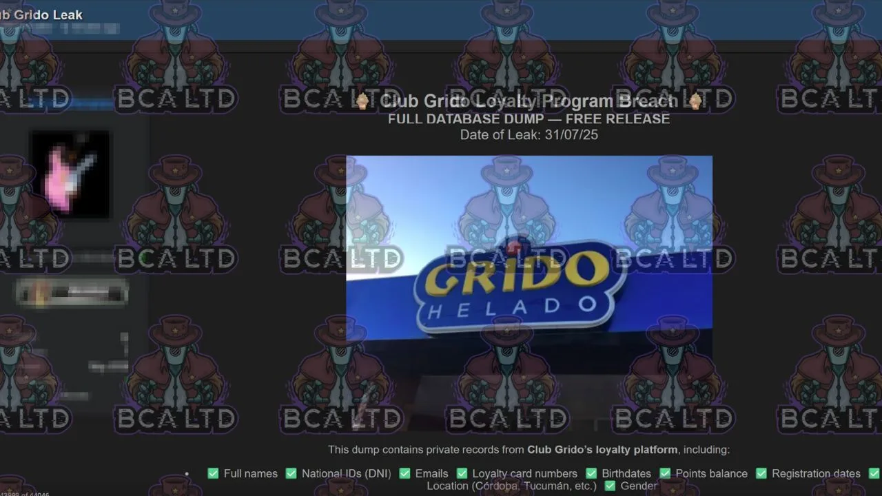 Un nuevo episodio de vulneración cibernética ha sacudido a una reconocida empresa del sector alimenticio en Argentina. Según reportes del portal especializado Birmingham Cyber Arms, un actor de amenazas (Threat Actor) filtró en foros clandestinos la base de datos completa del programa de fidelidad de Heladerías Grido, comprometiendo información personal de usuarios de todo el país. El contenido fue publicado inicialmente en la dark web y luego eliminado, aunque ya circulaba ampliamente en redes de intercambio de datos.
