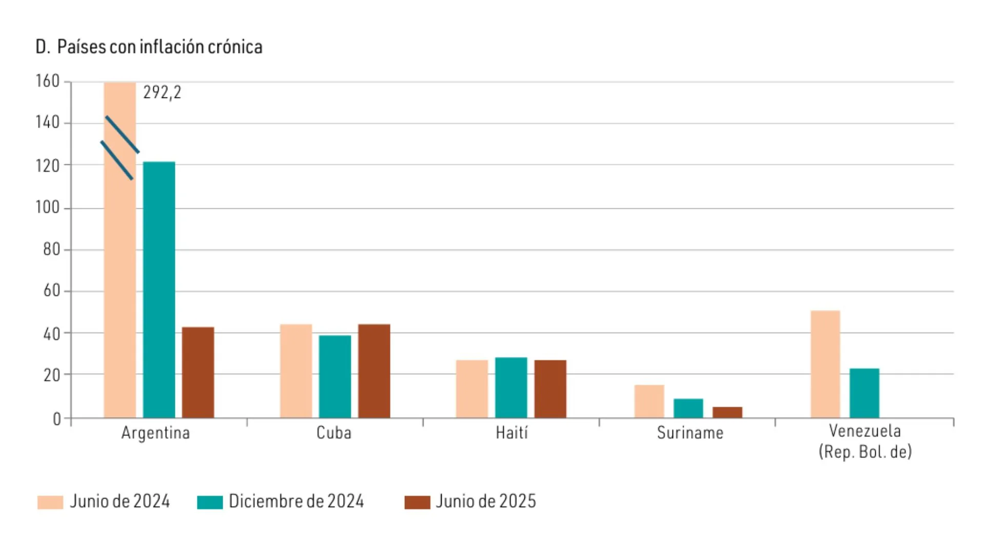 El informe de la CEPAL revela que 22 de las 33 economías de la región lograron reducir su tasa anual de inflación entre diciembre de 2023 y diciembre de 2024, donde las más pronunciadas (de más de 10 puntos porcentuales) se observaron en economías con antecedentes de “inflación crónica” como la Argentina, Surinam y Venezuela. “En los casos de la Argentina y Venezuela (República Bolivariana de), la disminución de la inflación refleja, entre otros factores, un cambio significativo en la evolución del tipo de cambio”, resalta.