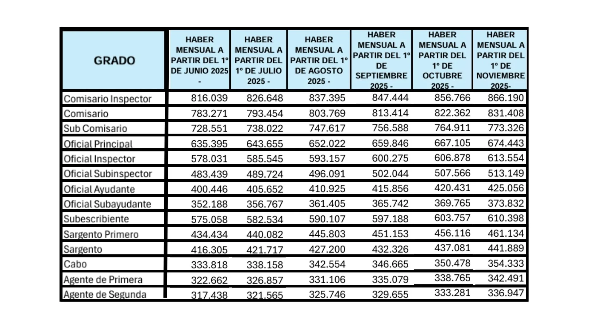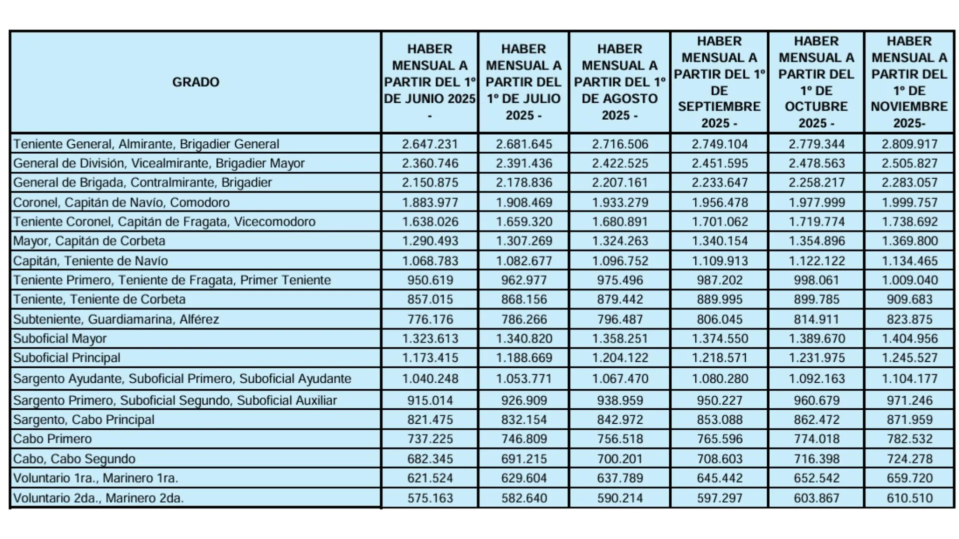 Mediante la Resolución Conjunta 63/2025, publicada en el Boletín Oficial, los ministerios de Economía y Defensa fijaron una nueva escala de haberes mensuales para el personal militar de las Fuerzas Armadas y de la Policía de Establecimientos Navales, correspondiente a los meses de junio, julio, agosto, septiembre, octubre y noviembre de 2025. La medida se enmarca en la evaluación escalonaria del personal, y responde a los criterios salariales adoptados para la Administración Pública Nacional.