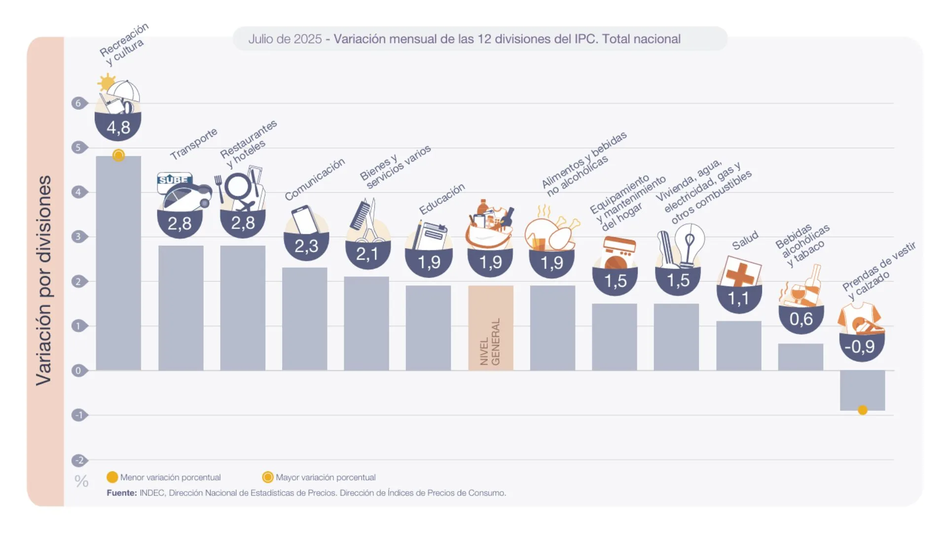 El dato se ubicó levemente por encima del 1,6% de junio y en línea con lo que esperaba el mercado, considerando que la inflación de julio tuvo un acumulado del 17,3% en lo que va de 2025. Durante julio, los principales aumentos se dieron en los sectores de alimentos y bebidas no alcohólicas (1,9%); transporte (2,8%), vivienda, agua, electricidad y gas (1,5%); y salud (1,1%).