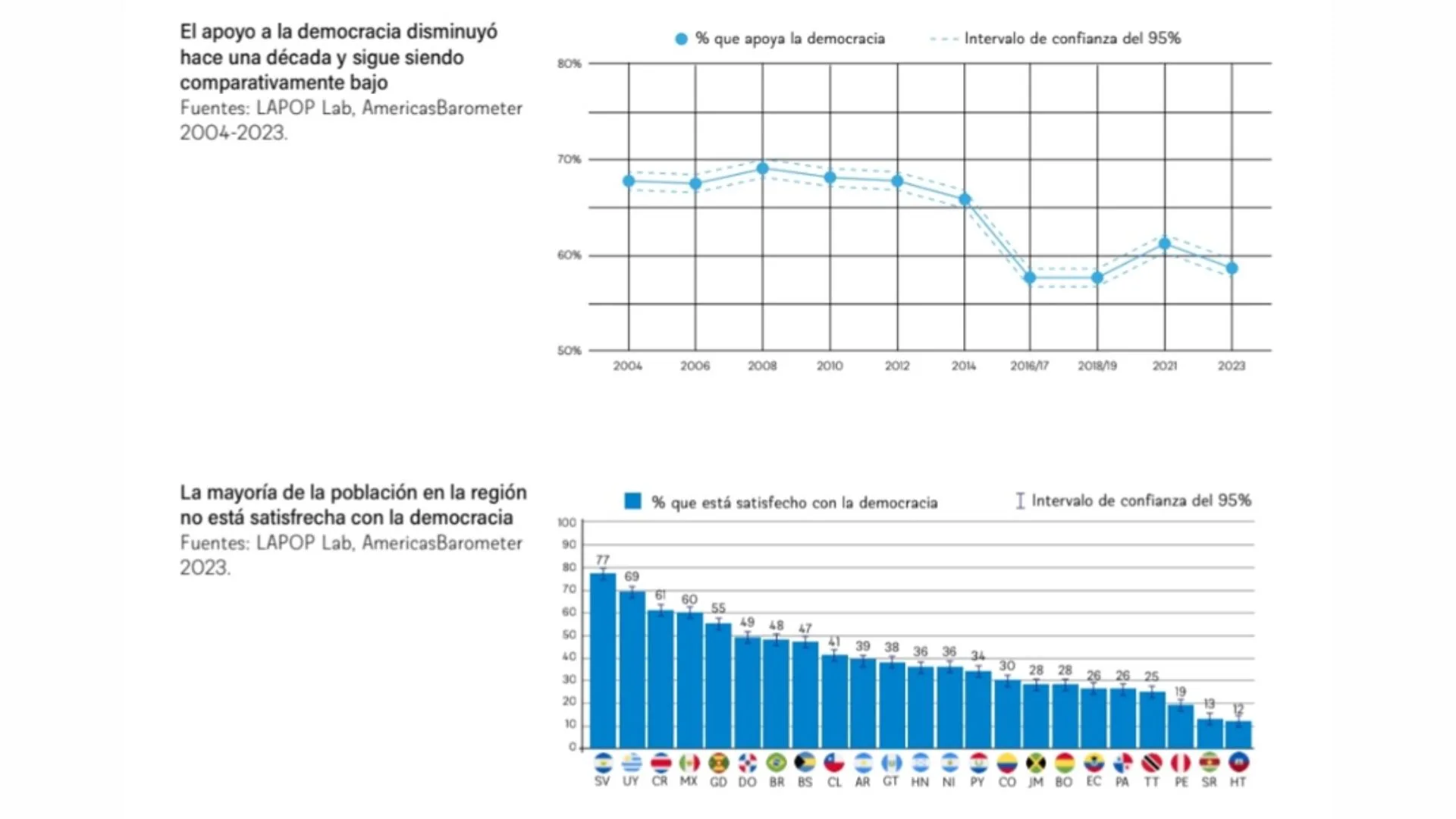 Hay también, insatisfacción con el desempeño de las instituciones democráticas y su capacidad para satisfacer las necesidades de la ciudadanía como la seguridad y la economía y un desencanto con las instituciones.