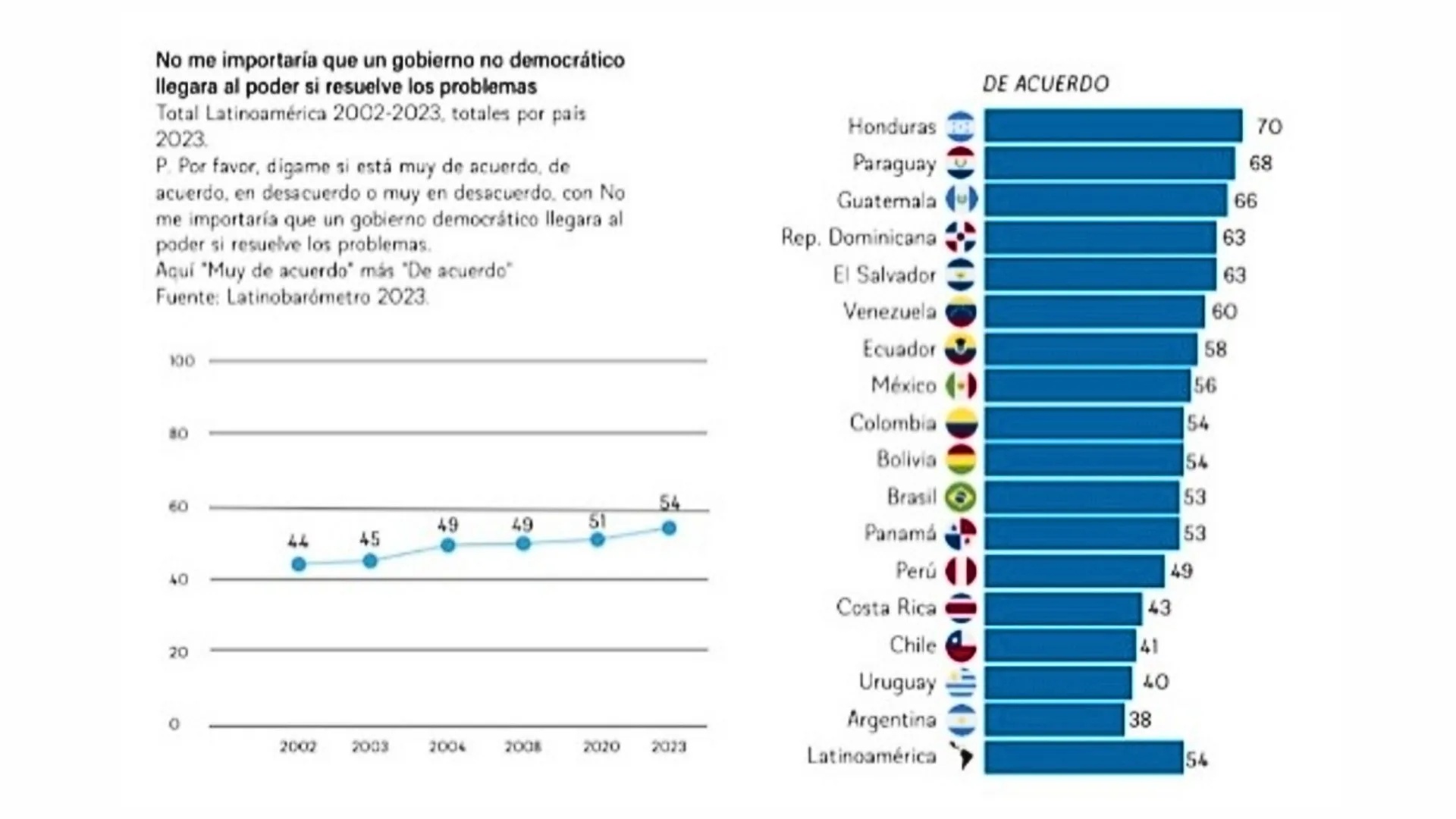 Un dato preocupante es que el 48% de jóvenes de 18 a 35 años, justifica un golpe de estado si este pudiera reducir la criminalidad, lo cual visualiza un avance del autoritarismo.
