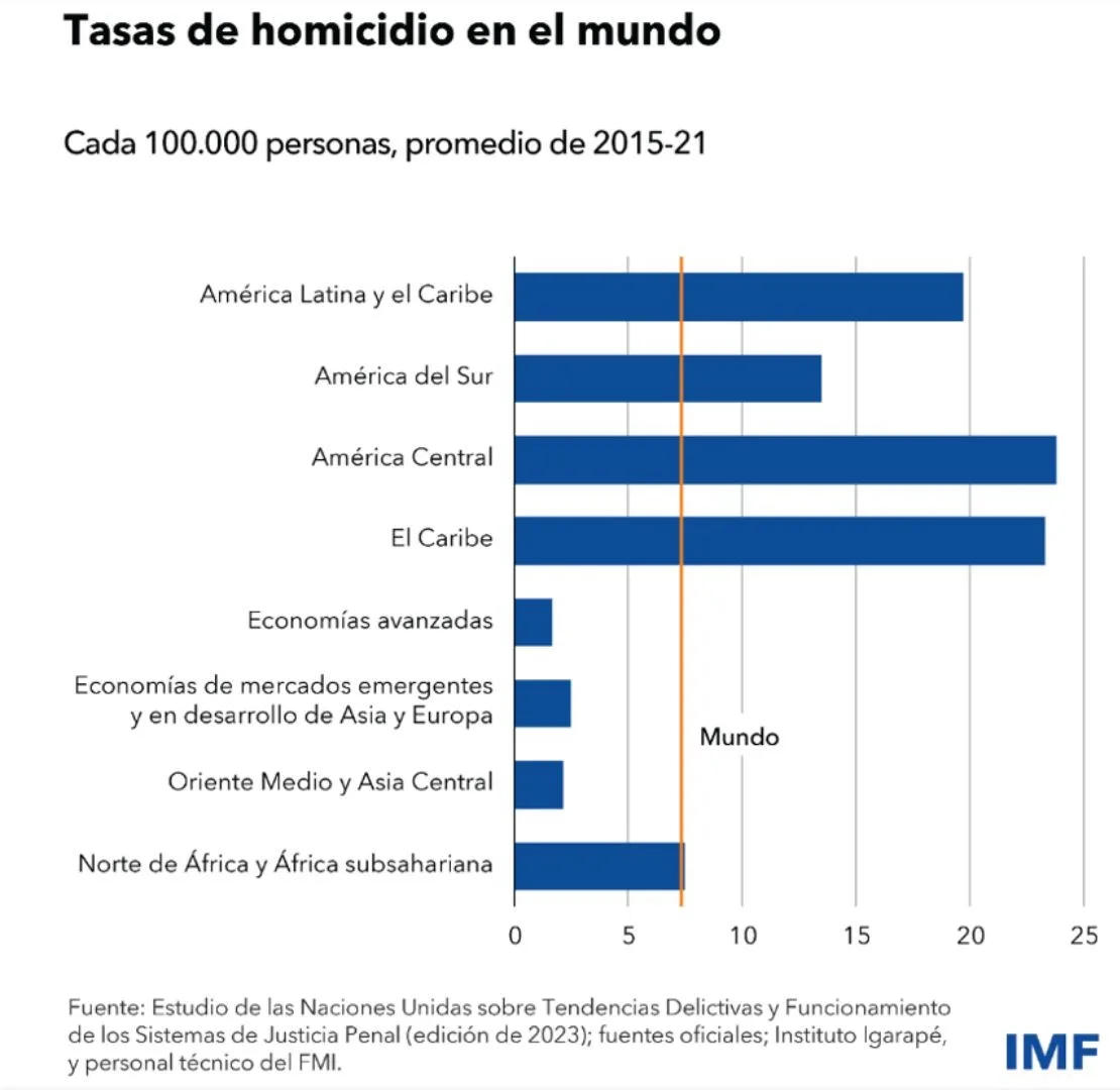 América Latina representa el 29% de los homicidios a nivel mundial (130.000 homicidios). La tasa promedio de homicidios en la última década es casi 12 veces mayor que la de las economías avanzadas, 8 veces mayor que en los mercados emergentes y alrededor de 3 veces el promedio mundial; Ocho de los diez países más violentos del mundo y 40 de las 50 ciudades más peligrosas se encuentran en AL.