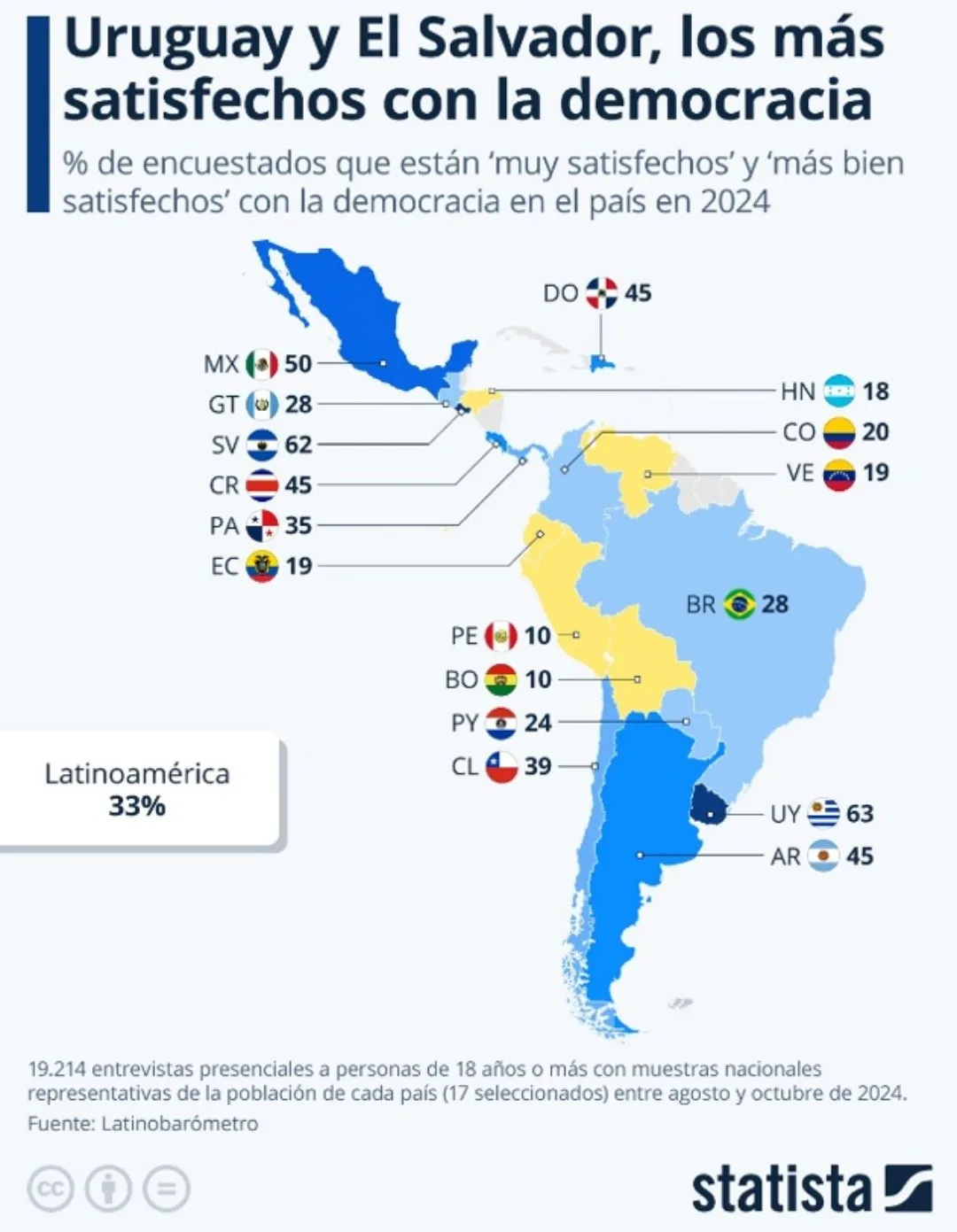 Según Latino barómetro, hay una disminución en el apoyo a la democracia en América Latina, con solo el 48% de la población regional respaldando este sistema de gobierno en el último informe.