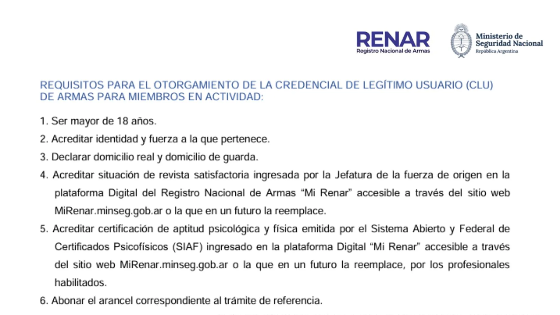 En este contexto, se aprobó el instructivo para Altas y Bajas de material institucional y el instructivo para la obtención de la condición de legítimo usuario del material. Sobre esto último, los requisitos para el otorgamiento de la credencial implican ser mayor de 18 años; acreditar identidad y fuerza a la que pertenece; declarar domicilio real y domicilio de guarda; acreditar situación de revista satisfactoria ingresada por la Jefatura de la fuerza de origen en la plataforma Digital; acreditar certificación de aptitud psicológica y física emitida por el Sistema Abierto y Federal de Certificados Psicofísicos (SIAF); abonar el arancel correspondiente al trámite de referencia.