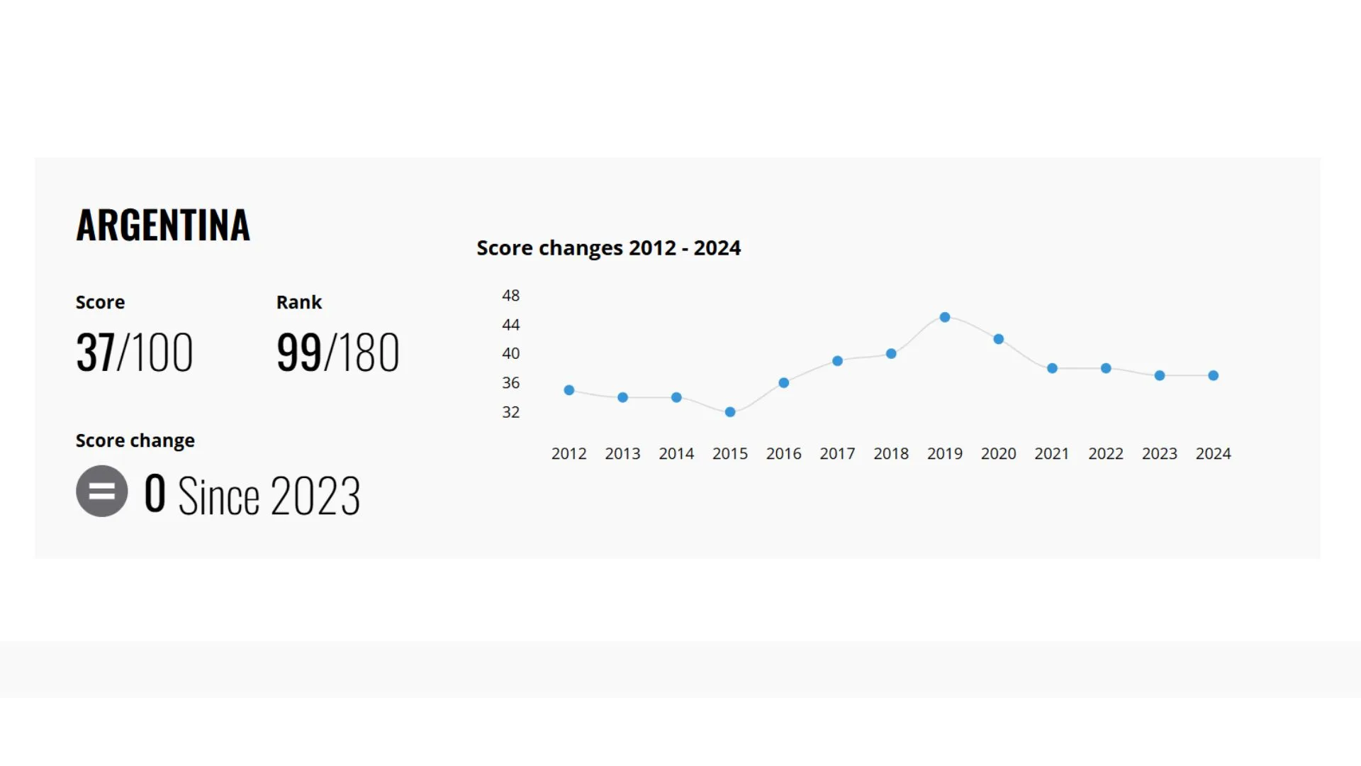 Con una puntuación de 180 países de todo el mundo, el Índice de Percepción de la Corrupción es el principal indicador mundial de la corrupción en el sector público, realizado por Transparency.org. En ese contexto, “Argentina ha obtenido una puntuación de 37 este año, con un cambio de 0 desde el año pasado, lo que significa que ocupa el puesto 99 de 180 países”, destaca el informe.