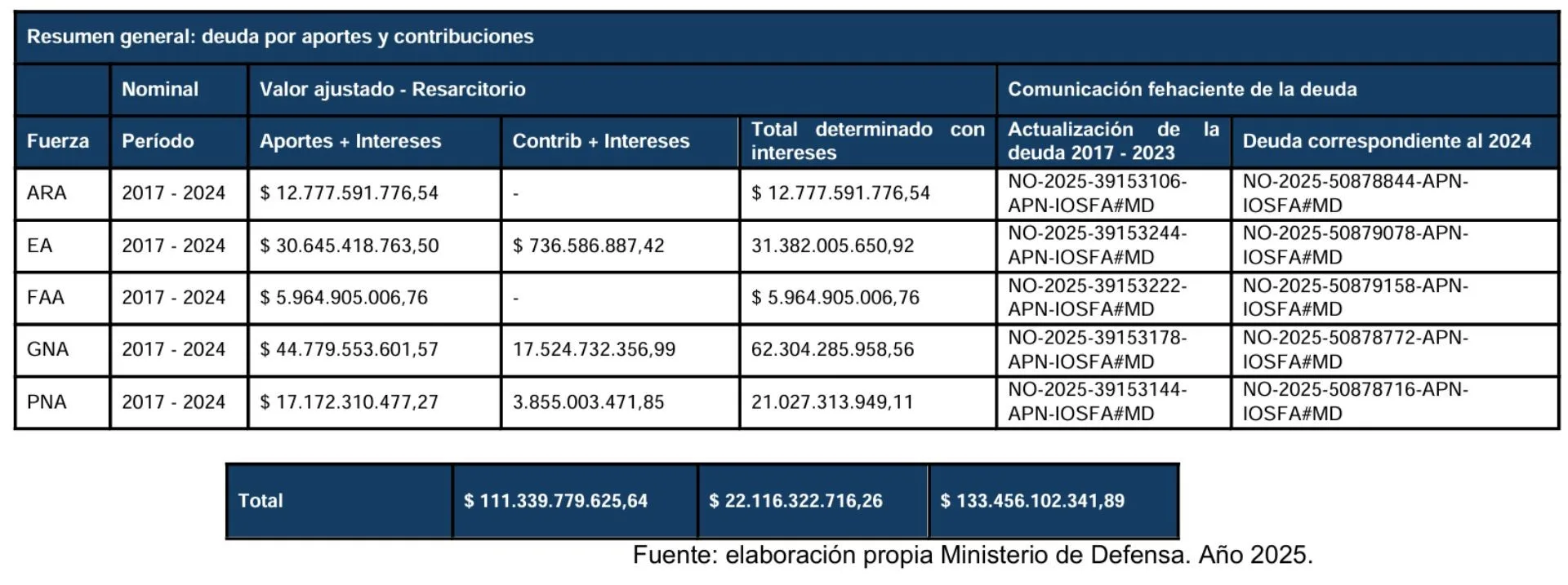 Sobre este punto, el ministerio de Defensa concluye en que al 31 de diciembre de 2024 la deuda en favor del IOSFA asciende a $133.456.102.341,89.