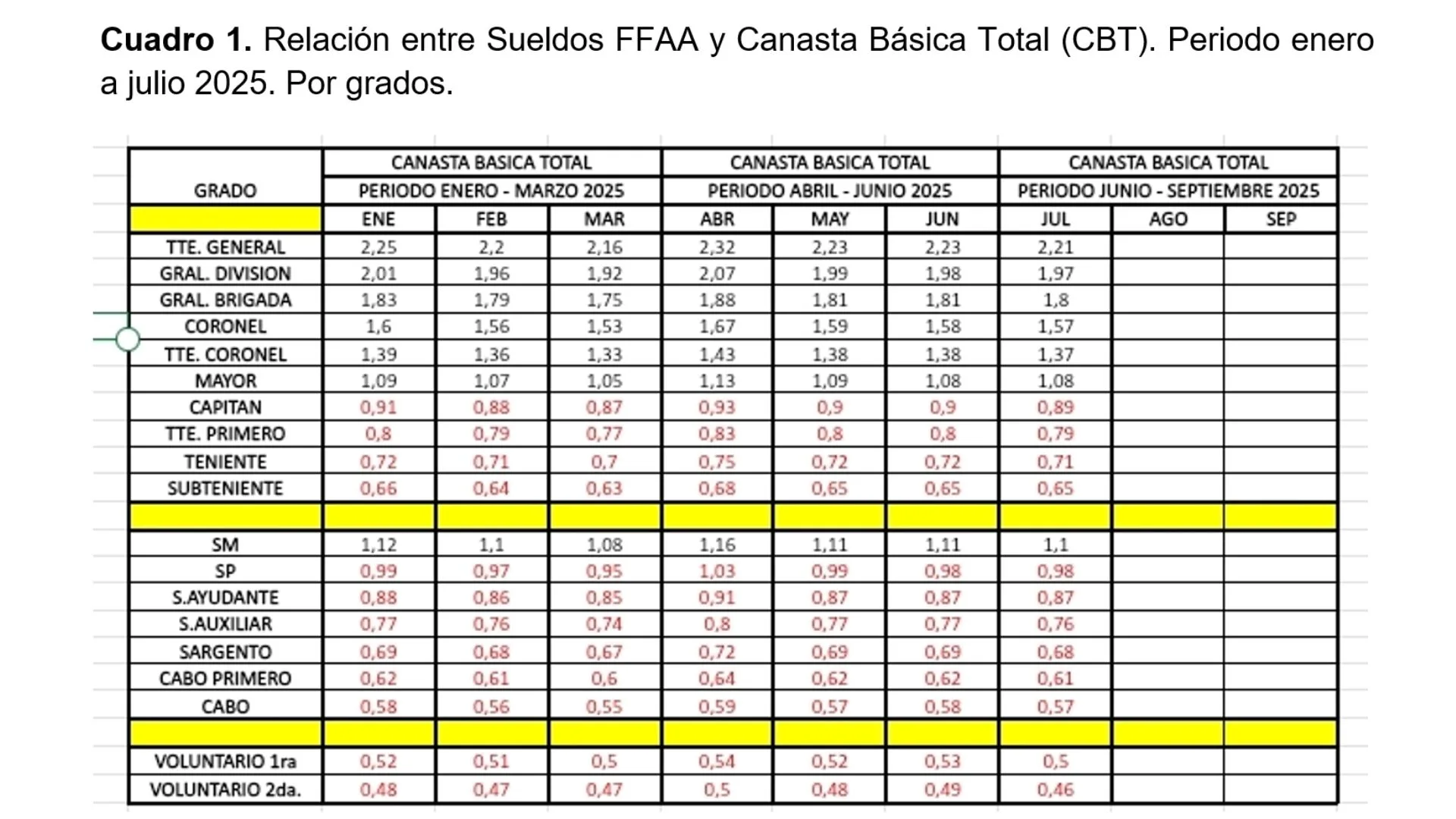 A grandes rasgos, el primer semestre de 2025 muestra una importante brecha salarial dentro de las FF.AA en relación con la CBT, ya que una parte considerable y creciente del personal de jerarquías medias y bajas se encuentra por debajo de la línea de la CBT. Esto refleja una situación de insuficiencia económica para cubrir las necesidades fundamentales de sus hogares.