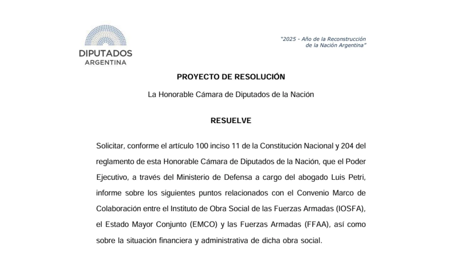 Diputados han solicitado un pedido de informes al Ministerio de Defensa, a cargo de Luis Petri, para conocer el alcance, financiamiento y ejecución del recientemente firmado Convenio Marco de Colaboración entre IOSFA, el Estado Mayor Conjunto y las Fuerzas Armadas. La iniciativa apunta a esclarecer el origen de los fondos, el impacto sobre los salarios militares y la transparencia en contrataciones por miles de millones de pesos.