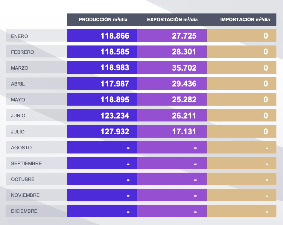 De hecho, se ha presentado una caída en la cifra de las exportaciones gasíferas, que en el mes de julio alcanzó los 6.524 Mm³/día, frente a un incremento paralelo de las importaciones, que alcanzó, por su parte, los 15.897 Mm³/día, reflejando un breve descenso respecto al mes de junio (17.668 Mm³/día). De esta manera, la balanza comercial gasífera muestra un severo déficit, en el cual las importaciones de gas natural duplican el margen de las exportaciones del sector.