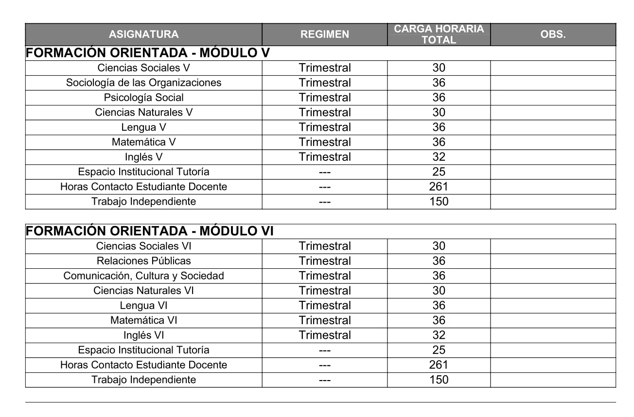 Los módulos que conforman la formación básica incluyen asignaturas troncales y comunes, como Ciencias Sociales, Matemática, Ciencias Naturales y Lengua, como así también actividades complementarias (Formación Ética y Ciudadana, Filosofía, Sociología, Psicología), tutorías institucionales y espacios de interacción directa entre el docente y el estudiante, a partir de la modalidad virtual. La formación orientada, por su parte, se enfoca en contenidos específicos y particulares de las Relaciones Humanas, dado que como se explicó el título es “Bachiller en Relaciones Humanas”.