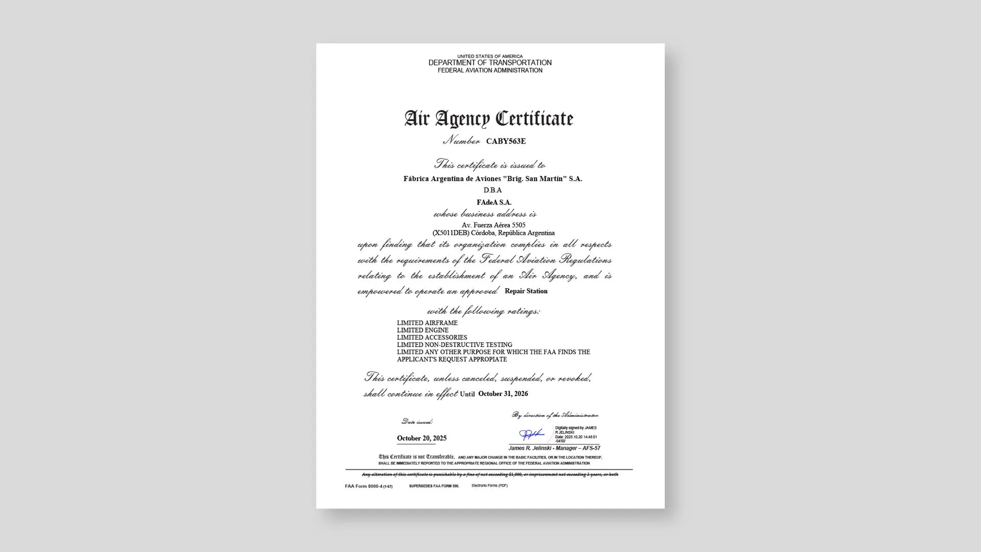 La Fábrica Argentina de Aviones “Brigadier San Martín” (FAdeA) alcanzó un nuevo hito en su trayectoria industrial al recibir la certificación de la Federal Aviation Administration (FAA) de los Estados Unidos como Approved Repair Station Nº CABY563E, bajo la normativa 14 CFR Part 145.