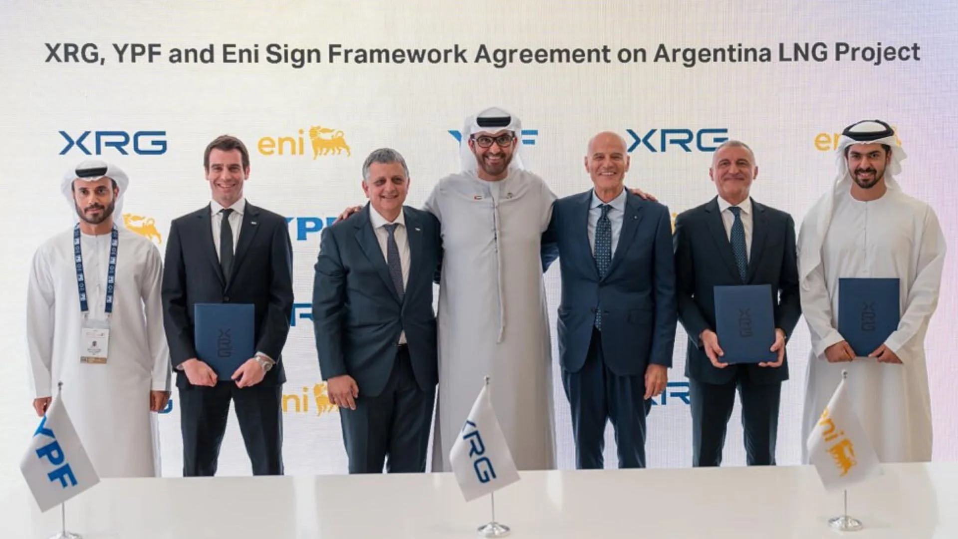 Junto al Ente Nazionale Idrocarburi (ENI), Yacimientos Petrolíferos Fiscales firmó un “Framework Agreement” (Acuerdo Macro) con XRG, el brazo internacional de inversiones de Abu Dhabi National Oil Company, “la mayor compañía de energía de los Emiratos Árabes y una de las 10 más grandes del mundo”. Marín explicó que, de esta manera, la Argentina continúa fortaleciendo su proyecto de GNL, con socios internacionales “de primer nivel”, y con el foco puesto en transformar no sólo YPF sino a la Argentina en un exportador nato de energía, de cara a la próxima década, que según se estima tenderá a la transición energética. Este primer paso permitirá que YPF y ENI avancen en los acuerdos necesarios para la incorporación definitiva de XRG al proyecto, que ya suma a una serie de estratégicos socios comerciales.