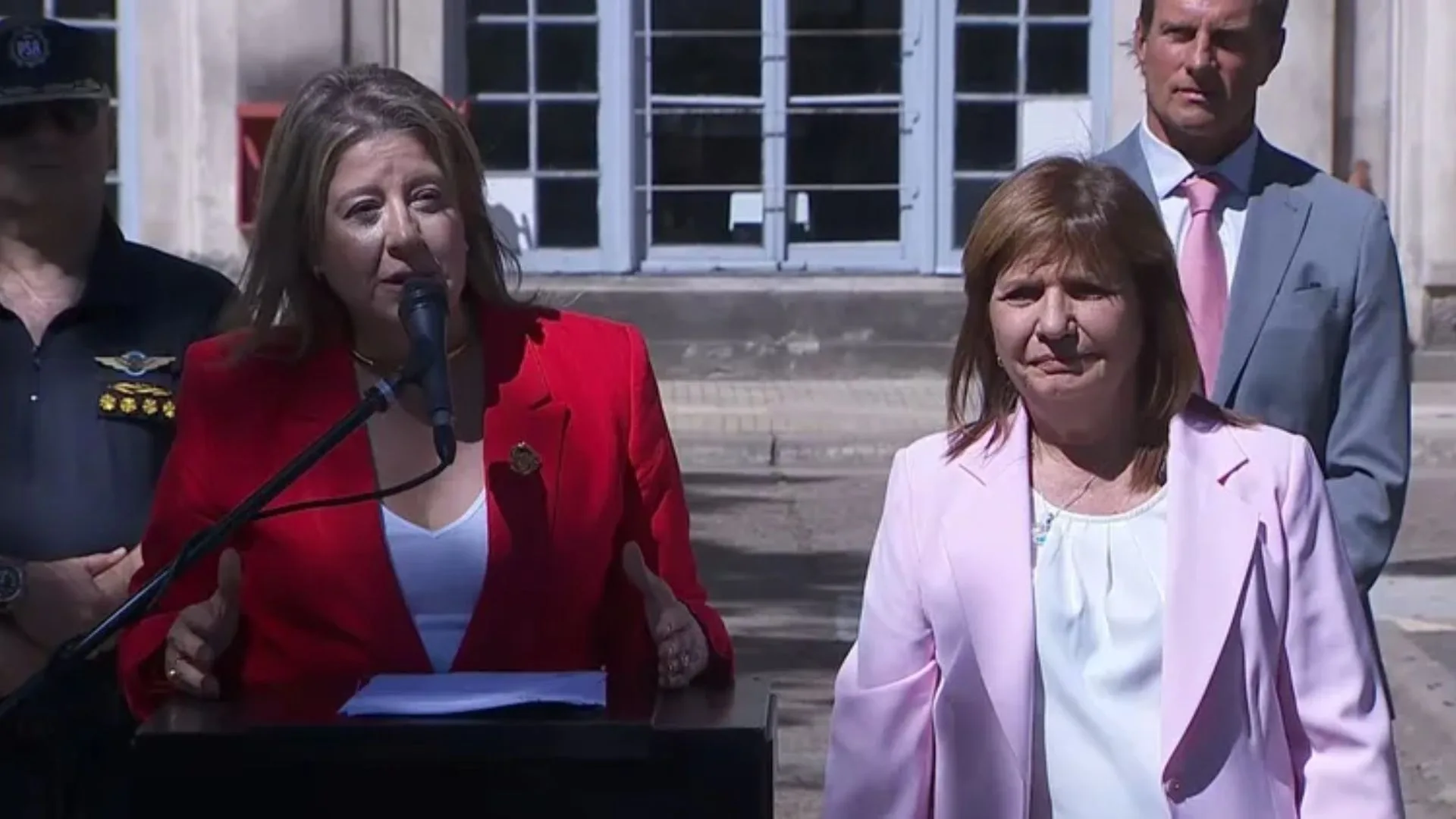 Patricia Bullrich presentando la nueva Agencia Nacional de Migraciones, un organismo desconcentrado para administrar las migraciones de manera integral y reforzar la lucha contra los delitos trasnacionales, quien estuvo acompañada por la secretaria de Seguridad, Alejandra Monteoliva, quien sucederá a Bullrich en el cargo. Fuente: Ministerio de Seguridad Nacional